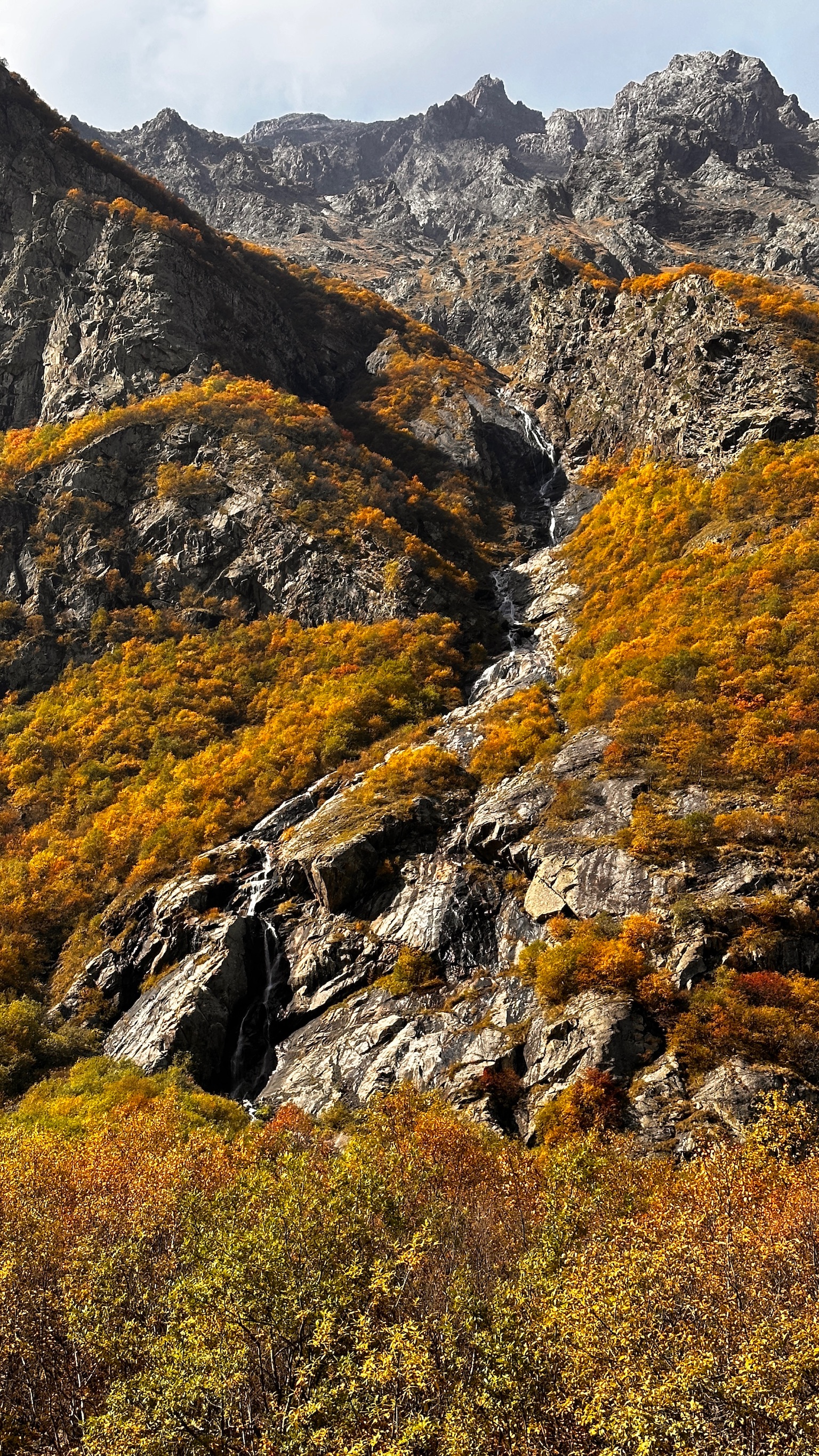 Алагирское ущелье. Начало маршрута — живописная дорога через Алагирское ущелье. Горная трасса с видами на бурные реки и скалистые склоны, одетые в осенний наряд.