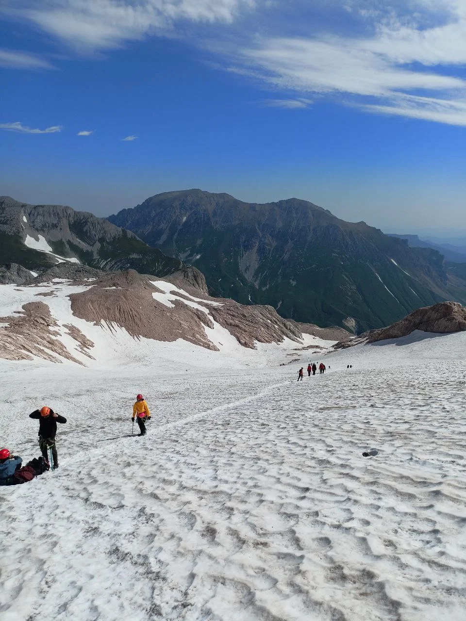 День: переход под Красные скалы. Преодоление скального участка. Подъем к Фиштинскому леднику. Переход через ледник. Преодоление скального участка. Выход на гребень. Подъем на вершину горы Фишт.