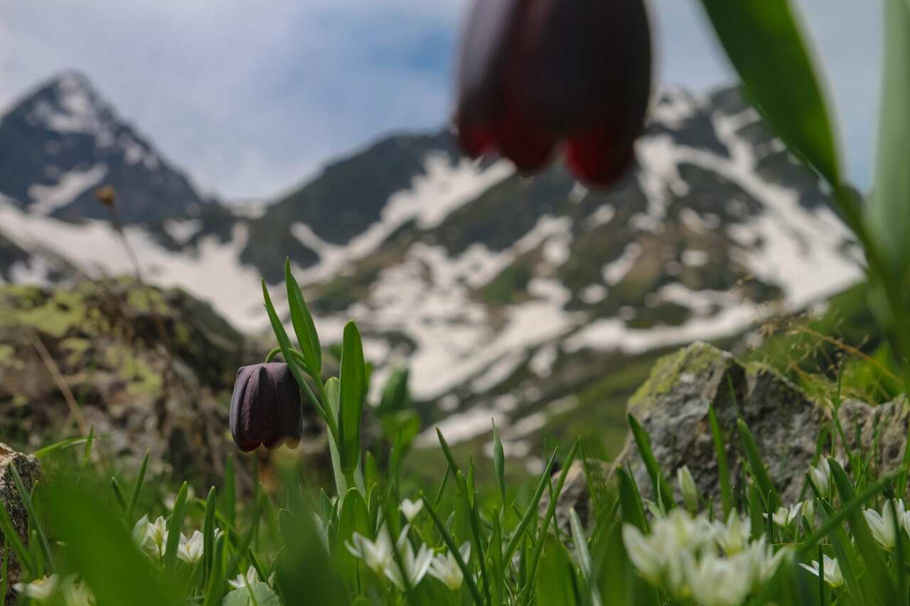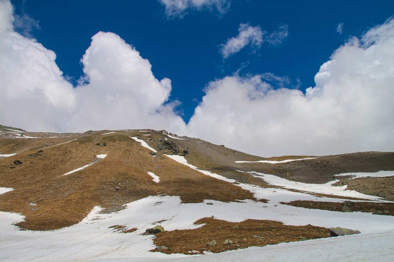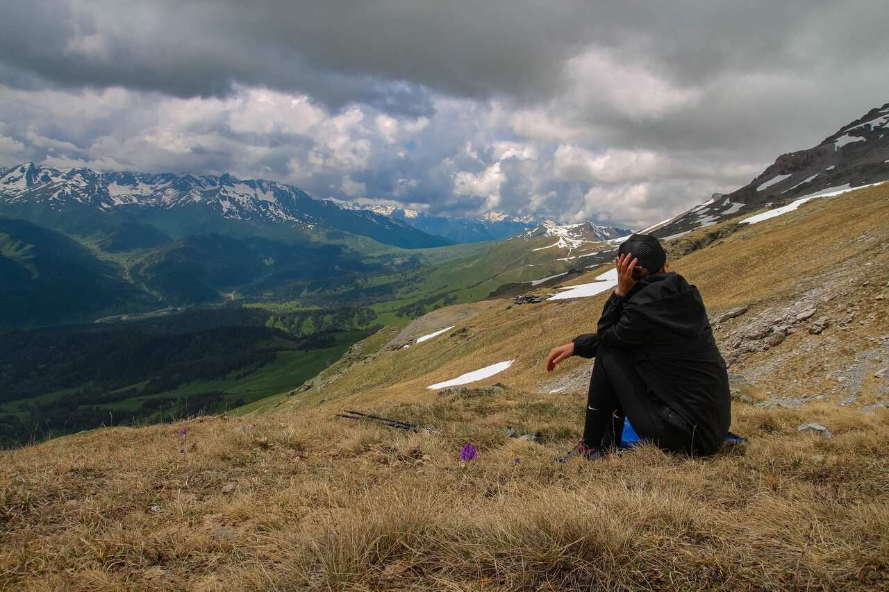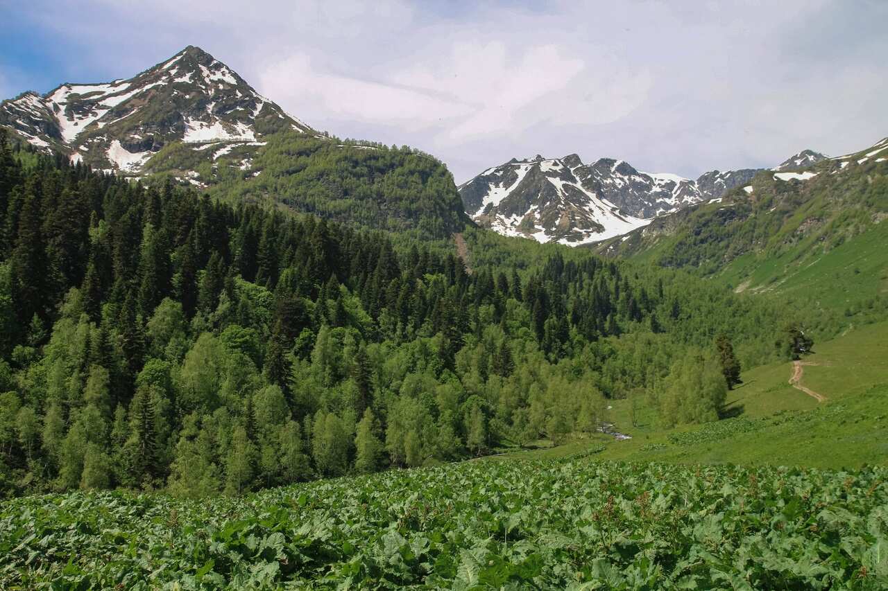 На тропе к перевалу, названному в честь писателя и геодезиста Григория Федосеева, будет не очень легко: ближе к вершине подъем идет круто наверх, а субальпийские и альпийские луга сменяются сыпучими камнями. Но вид нас не разочарует. Облака цепляются за вершины напротив. За спиной бескрайние зеленые долины и ущелья с озерами, реками и водопадами.