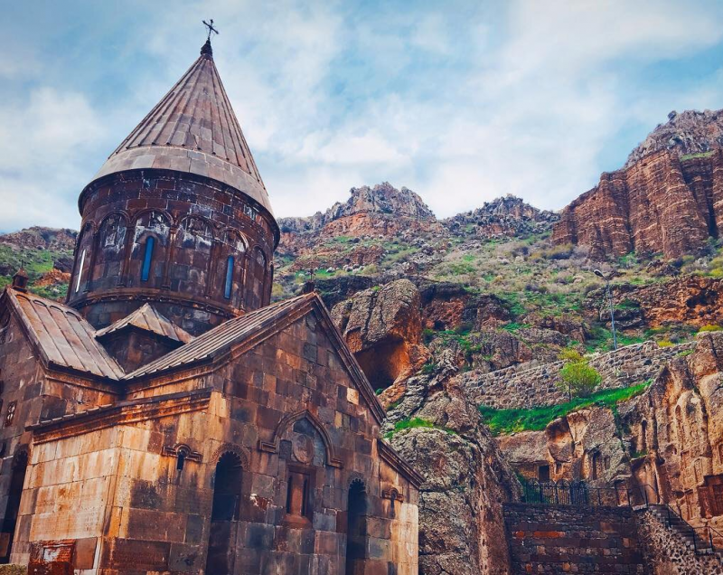 Затем поедем в монастырь Гегардаванк - «Монастырь копья», древнейший вырубленный в скале храм. Название связано с хранившимся здесь копьем Лонгина, копьем римского легионера, которым по преданию был пронзен на кресте Иисус Христос.