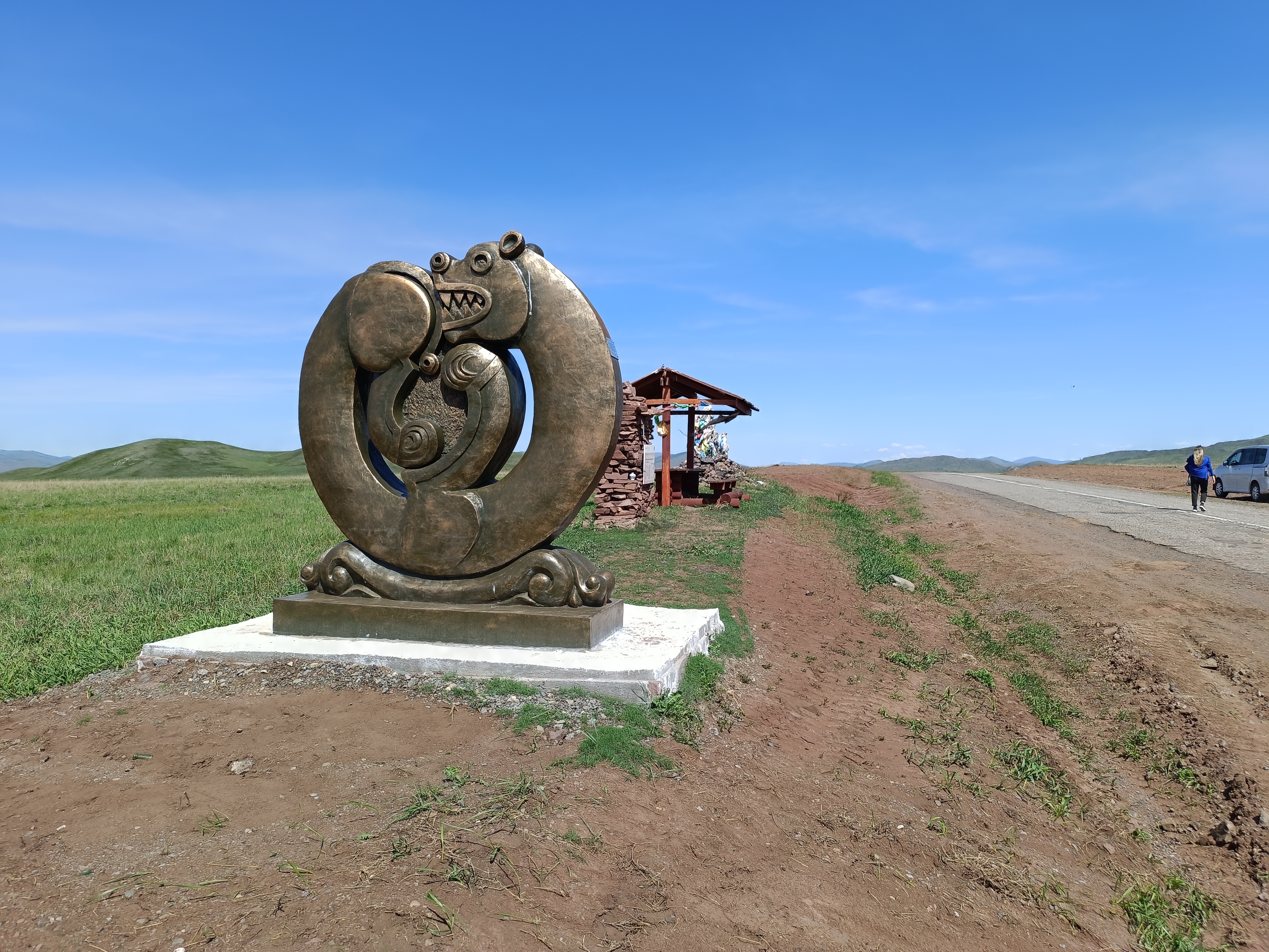 Описание: Символический памятник, обозначающий географический центр Азиатского континента. Представляет собой высокий обелиск, окруженный скульптурами мифических существ (арзыланов) и 12 животными буддийского гороскопа. Реконструирован в 2014 году по проекту скульптора Даши Намдакова.