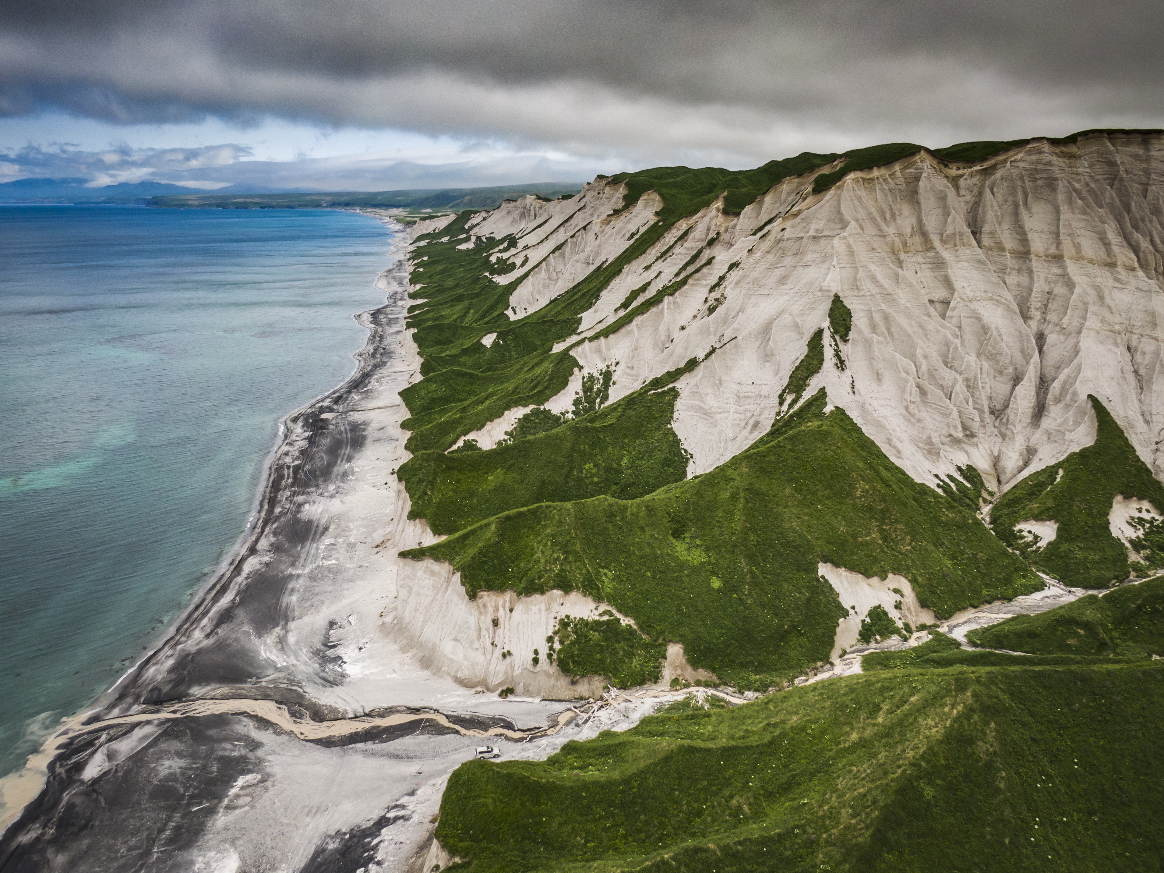 Приготовьтесь к захватывающему путешествию вдоль побережья Итурупа, где вас ждут поразительные контрасты природы от загадочных черных пляжей до ослепительно белых скал, от бушующего океана до умиротворяющих геотермальных источников.