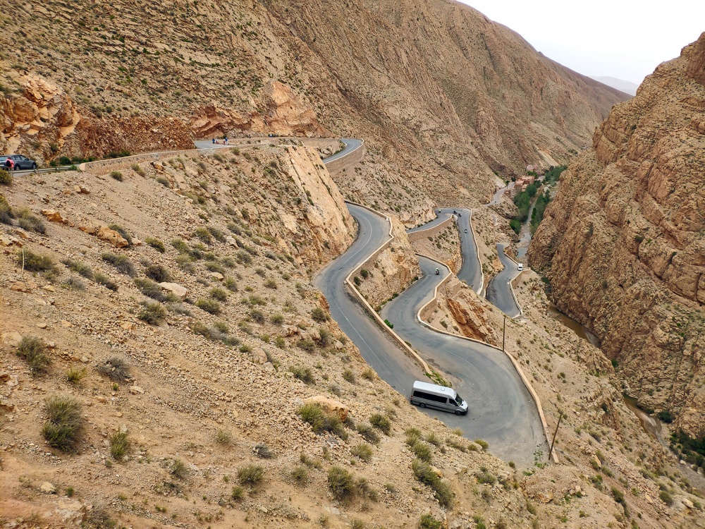 Следующий пункт на нашем пути — живописное ущелье Дадес. Вы не сможете сдержать восторженных возгласов! Круто уходящая вверх дорога, извивающаяся змейкой, отвесные стены скал и почти не заметная сверху ниточка реки, протекающей где-то в самом низу. Совершим прогулку по дну ущелья и пофотографируемся.