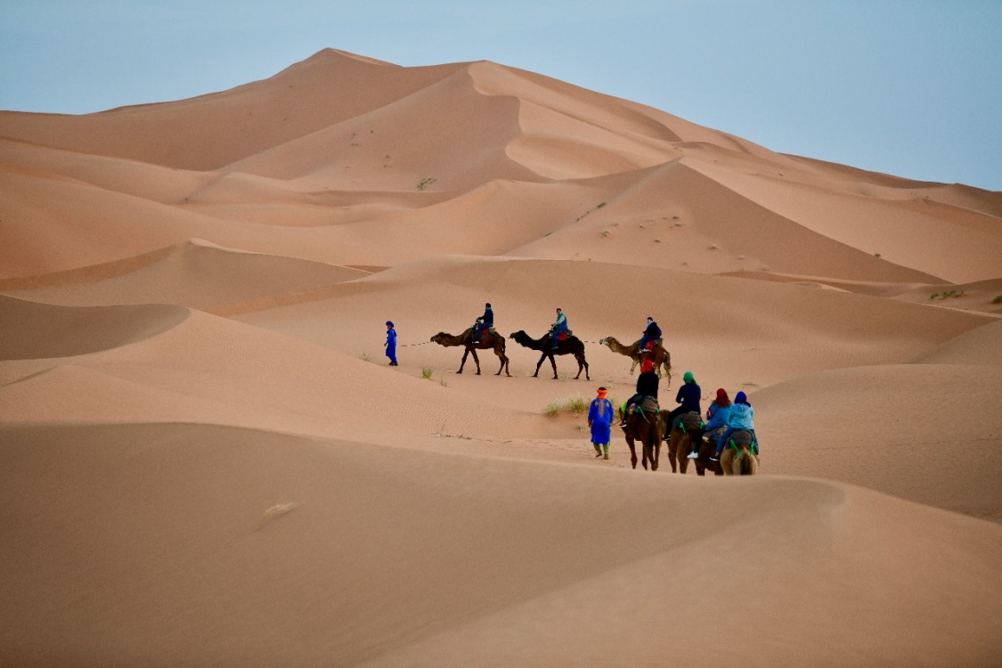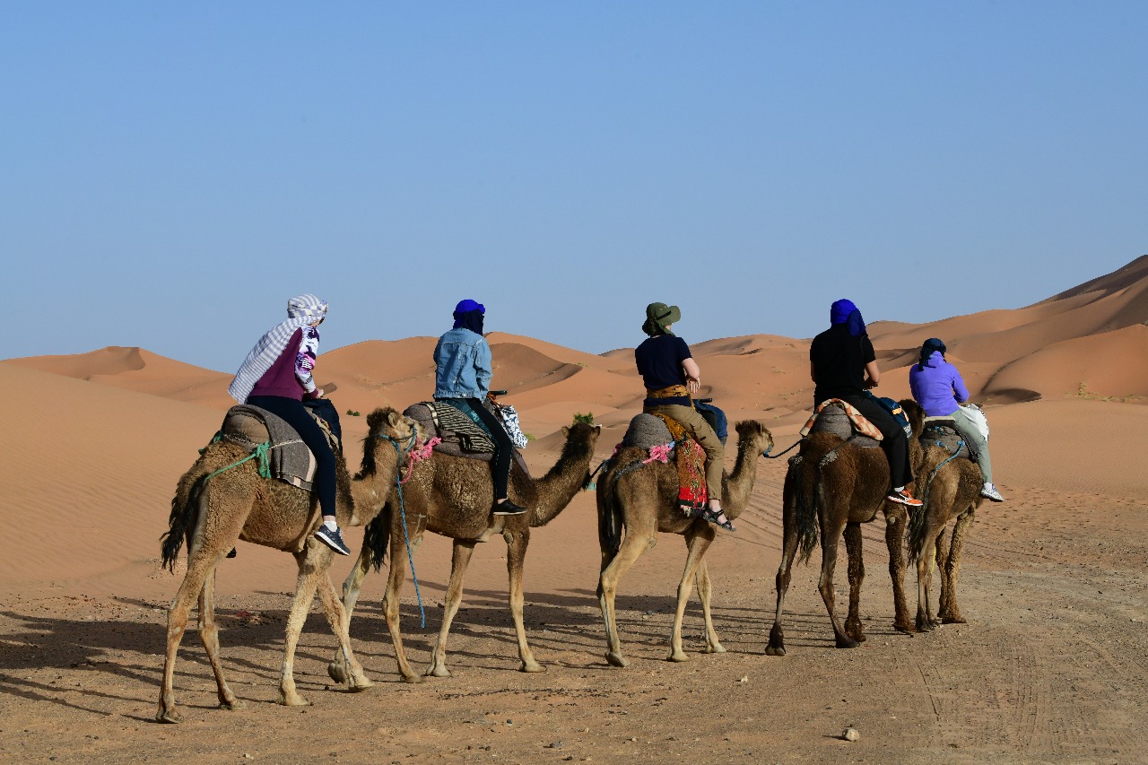 Вечером доедем до деревни Мерзуга, откуда отправимся в дальнейший путь на верблюдах. Нас ждёт незабываемая прогулка! Будем двигаться по пустыне, плавно покачиваясь, и примерим на себя роль кочевников. Ночевать будем в национальных берберских жилищах — шатрах-палатках, но оснащённых современными удобствами: здесь есть туалеты и электричество. Нас ждёт незабываемый вечер под загадочными звёздами, с танцами и песнями у костра, посреди расстилающейся пустыни.