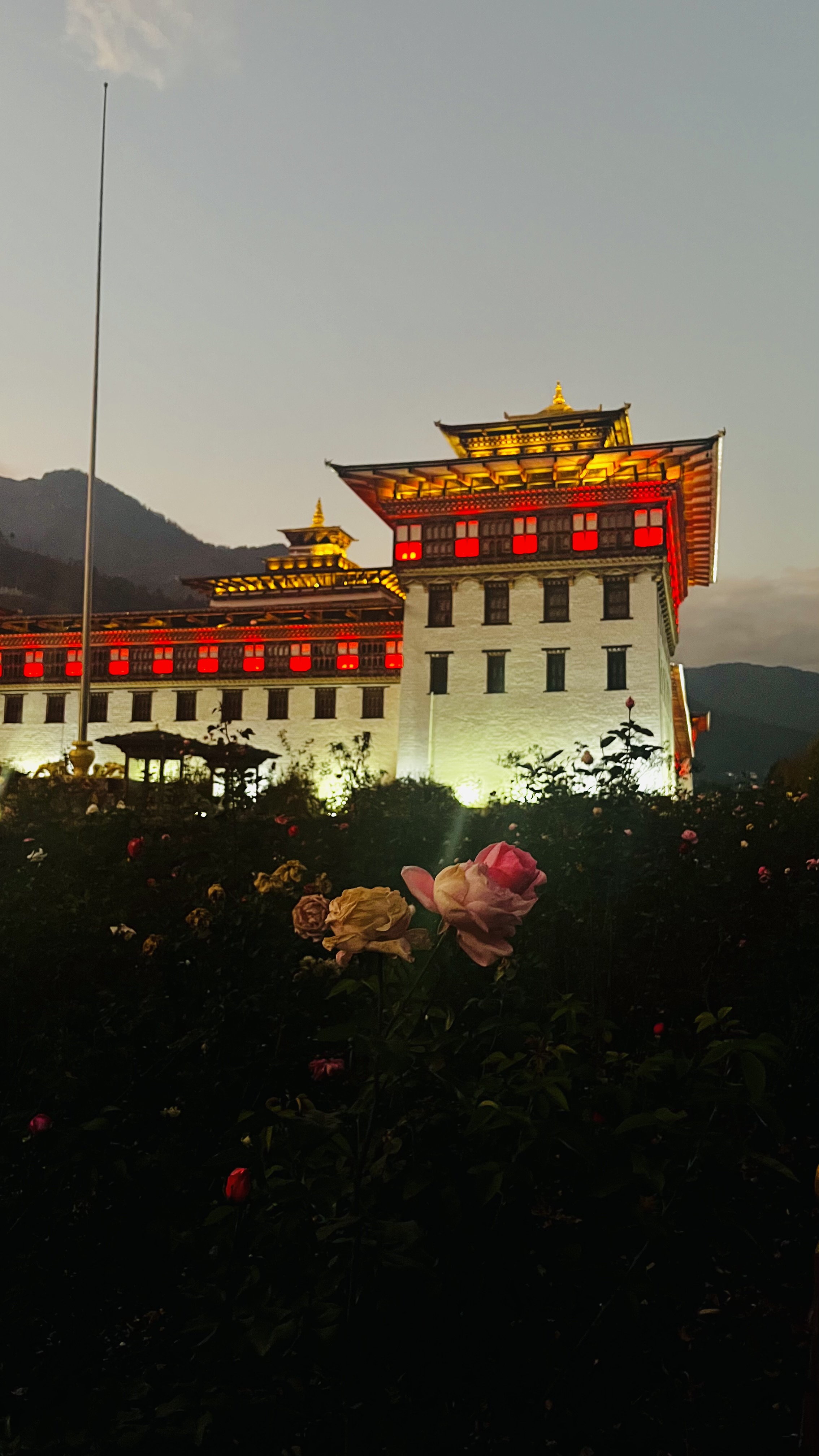 Завершаем день у Трашичхое-дзонга — величественной крепости, где соединились духовное и светское. Здесь заседает правительство, находится тронный зал короля и летняя резиденция главного настоятеля с монашеским корпусом.