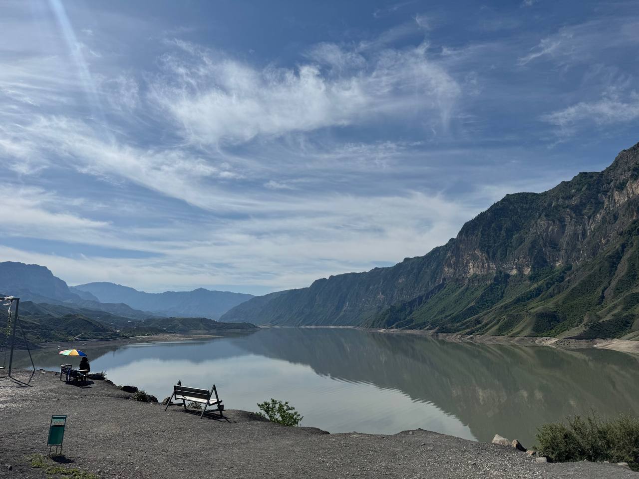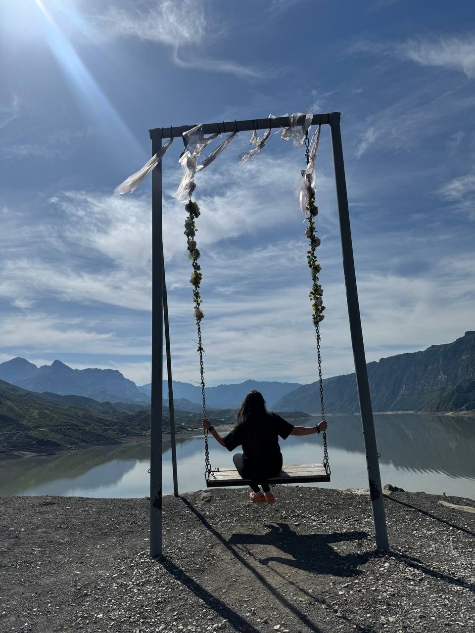 Отправляемся на Ирганайское водохранище, здесь невероятная красота гор отражающихся на водной глади, а так же парящие качели.