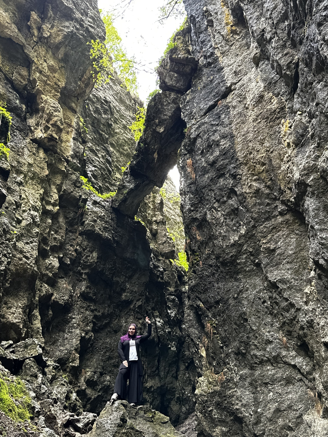 Завтракаем и едем в Карадахскую теснину — живописное ущелье с нависающими над тобой каменными глыбами.