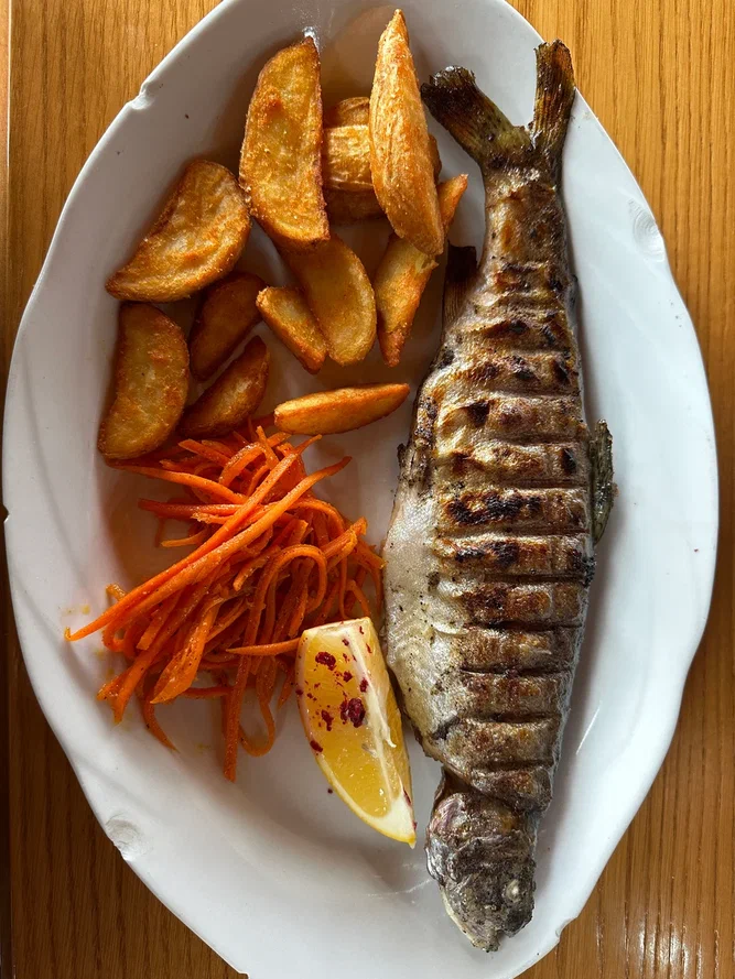 Обед с форелью или бараниной (выбирайте сами).