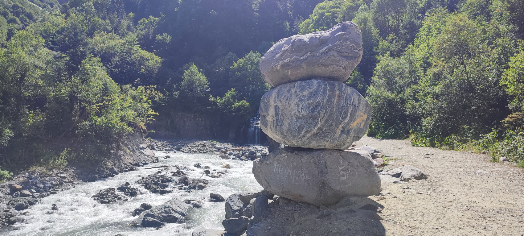 Утром завтракаем и отправляемся по военно-сухумской дороге к Гоначхирскому ущелью, преодолев на автомобиле серпантин окруженный многометровыми скалами, мы попадем к Туманному озеру (Туманлы-Кель), озеро отличается невероятной красотой воды и утопающими в зелени хребтами. А далее мы проедем дальше к кордону, преграждающему границу с Абхазией, и полюбуемся небольшим водопадом на реке Кичи-Муруджу.