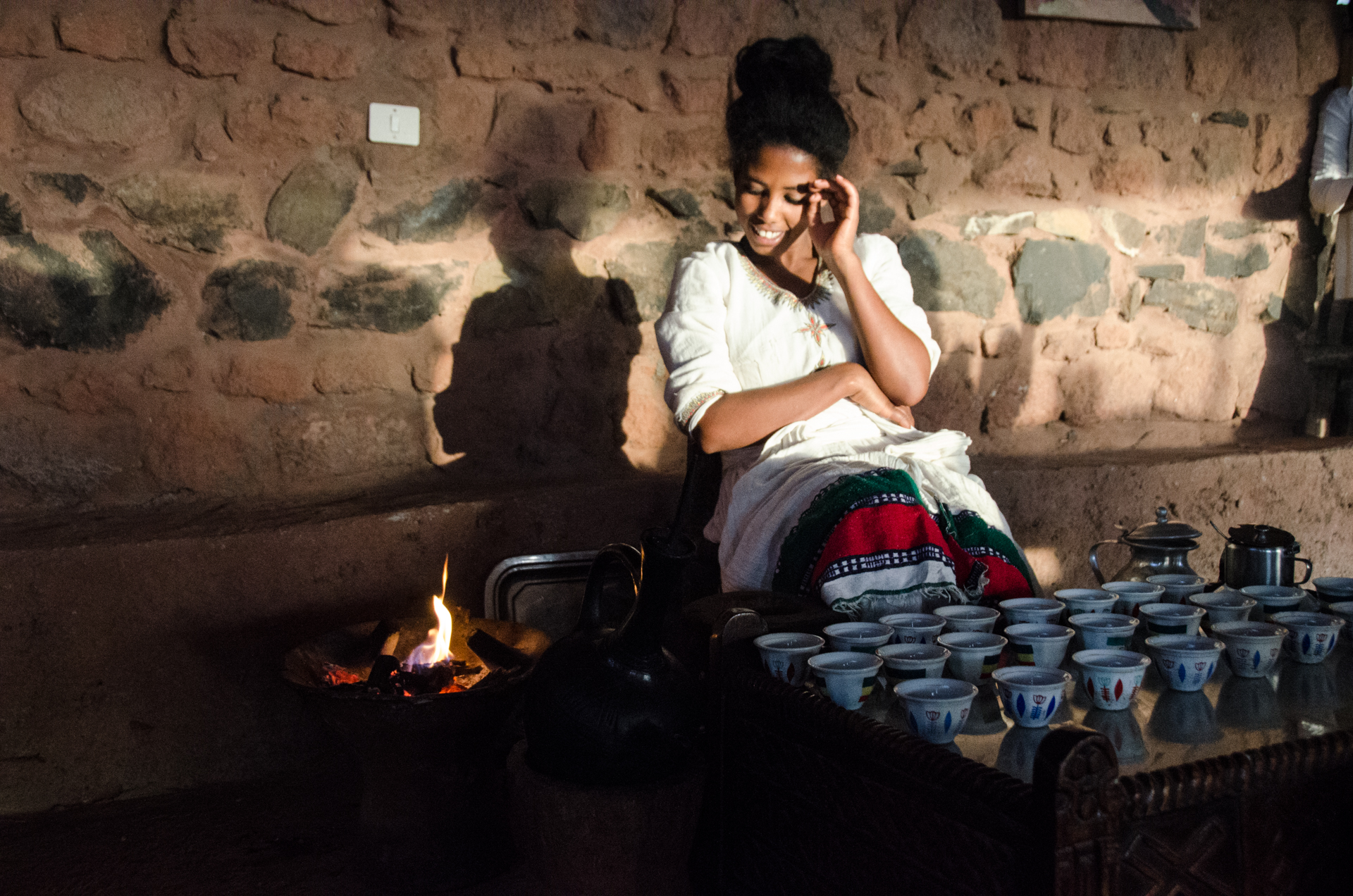 Распитие кофе происходит не кое-как, а по строгому ритуалу, называемому кофейной церемонией. В ходе церемонии на глазах присутствующих разворачивается почти весь процесс превращения ягоды в напиток, кроме ее предварительного высушивания. Заведующая церемонией девушка (а это всегда девушка, причем опытная - роль эта почетная) сперва долго жарит зерна, затем обносит всех участников зерном, чтобы они могли насладится его ароматом, потом долго крошит зерно в большой ступе, затем заваривает напиток в специальном кувшине и разливает его по чашечкам. Заваривают кофе трижды, и каждая заварка имеет как свой вкус, так и свое ритуальная назначение. Считается, что церемония, которая продолжается не менее часа, сближает людей, успокаивает их и наполняет энергией.