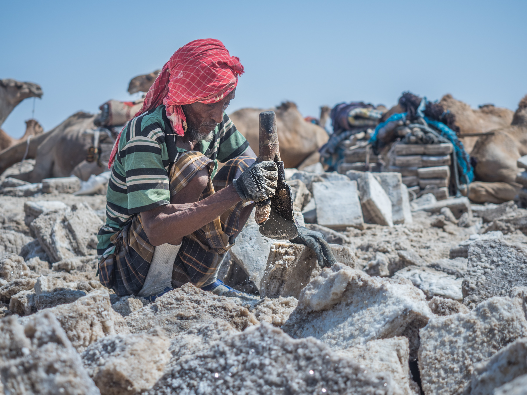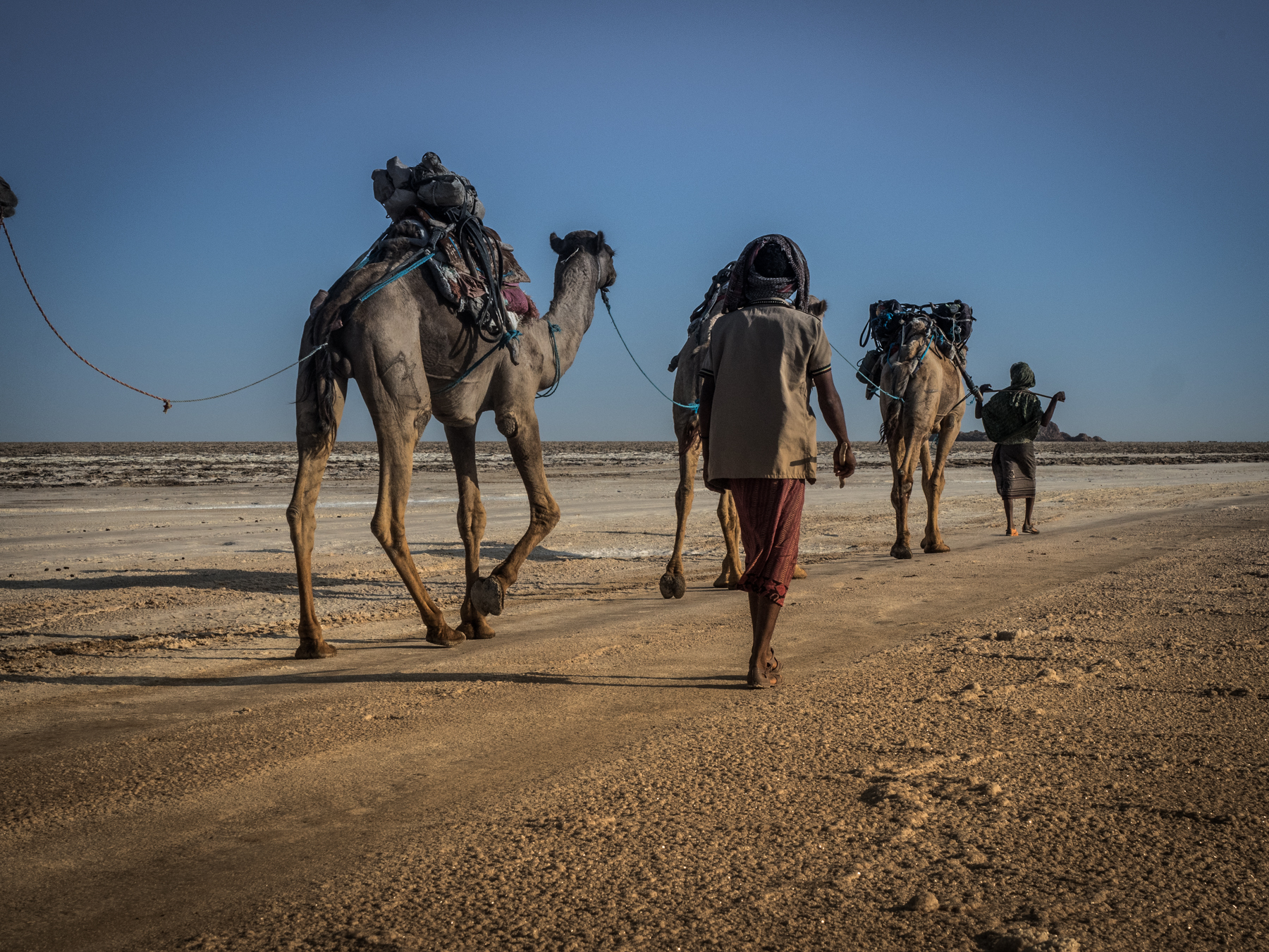 С утра если нам повезет, мы увидим один из бесконечных караванов, перевозящих через пустыню на эфиопское нагорье драгоценную соль. Эти караваны - бредущие по горам и пустыне как и тысячу лет тому назад - одни из последних реальных караванов на нашей земле.