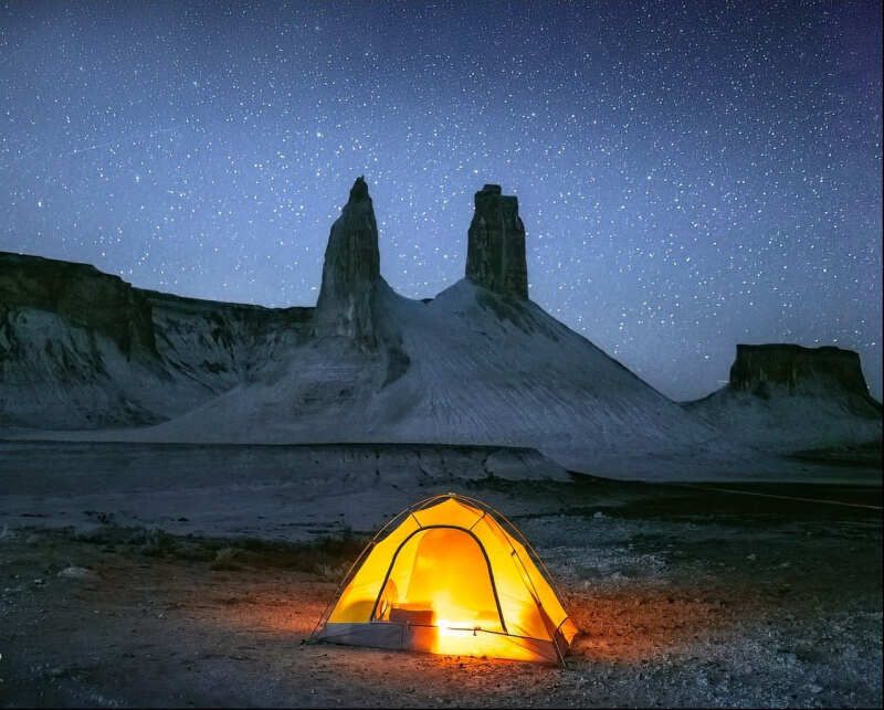 Ночлег предстоит в палатках возле гигантской меловой арки Тузбаира. Мы приготовим ужин и полюбуемся на закат над соляной пустыней, а потом на бесконечное звездное небо.