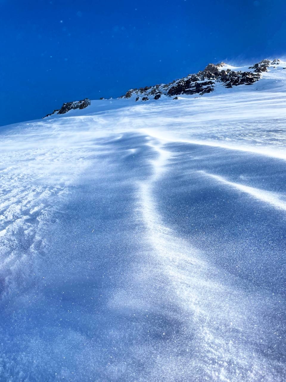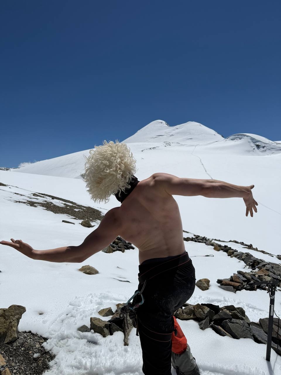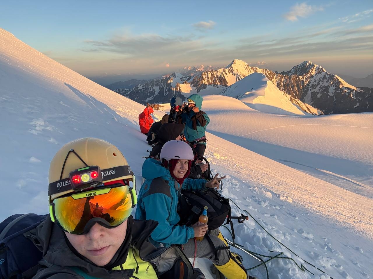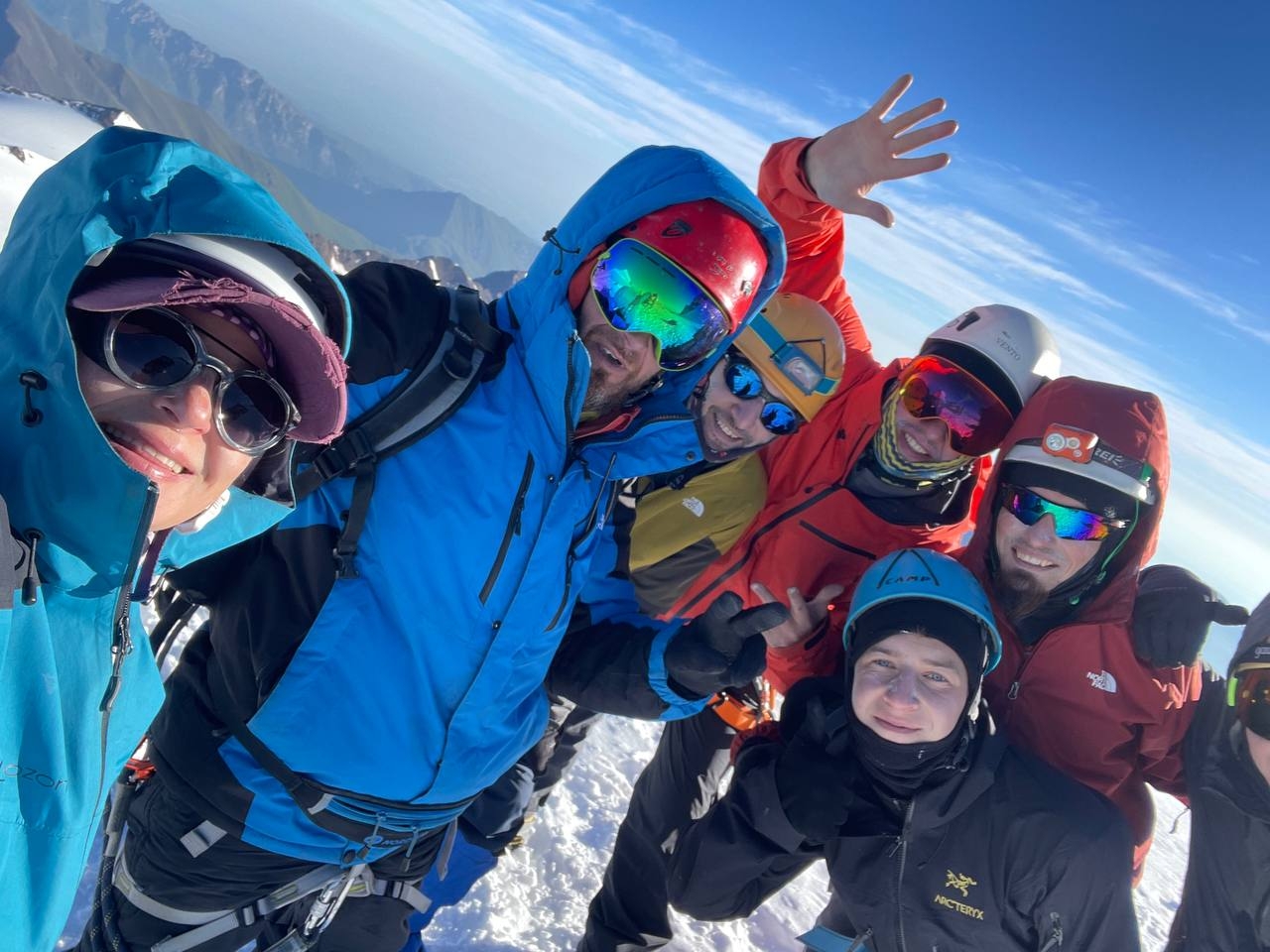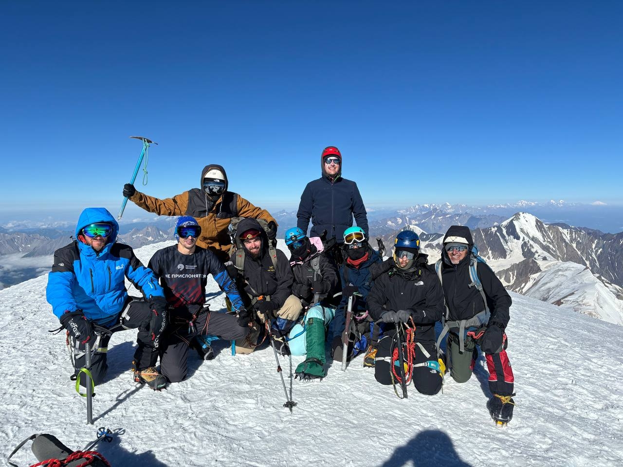 Вершина представляет собой ледовую шапку. подъем идет зигзагами по сформированным полкам. Местами требуется провешивание перил на ледобурах. И вот они — последние шаги! Вдруг взор перестает упираться в снежный склон. Перед тобой — бесконечное пространство космоса. В зависимости от погоды на вершине проводи 5-30 минут. На спуск идем также в связках. Если склон сильно обледеневший, организуем спуск дюльфером. На перевальной седловине пьем чай, делимся впечатлениями, отдыхаем 15-20 минут. Начинаем спуск с горы по пути подъема, также в связках. Стараемся не делать разрывов между связками. Случается, что плато быстро заполняется облаками, а следы заносятся ветром. Обратный путь занимает около 3 ч. В лагере обедаем, отдыхаем.