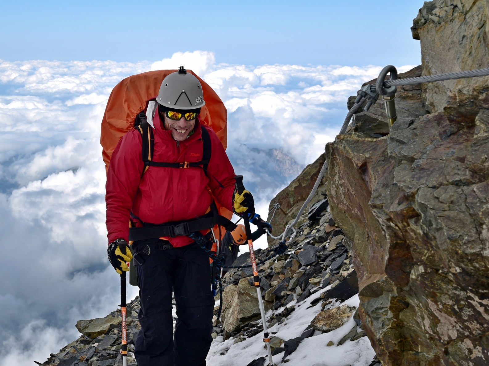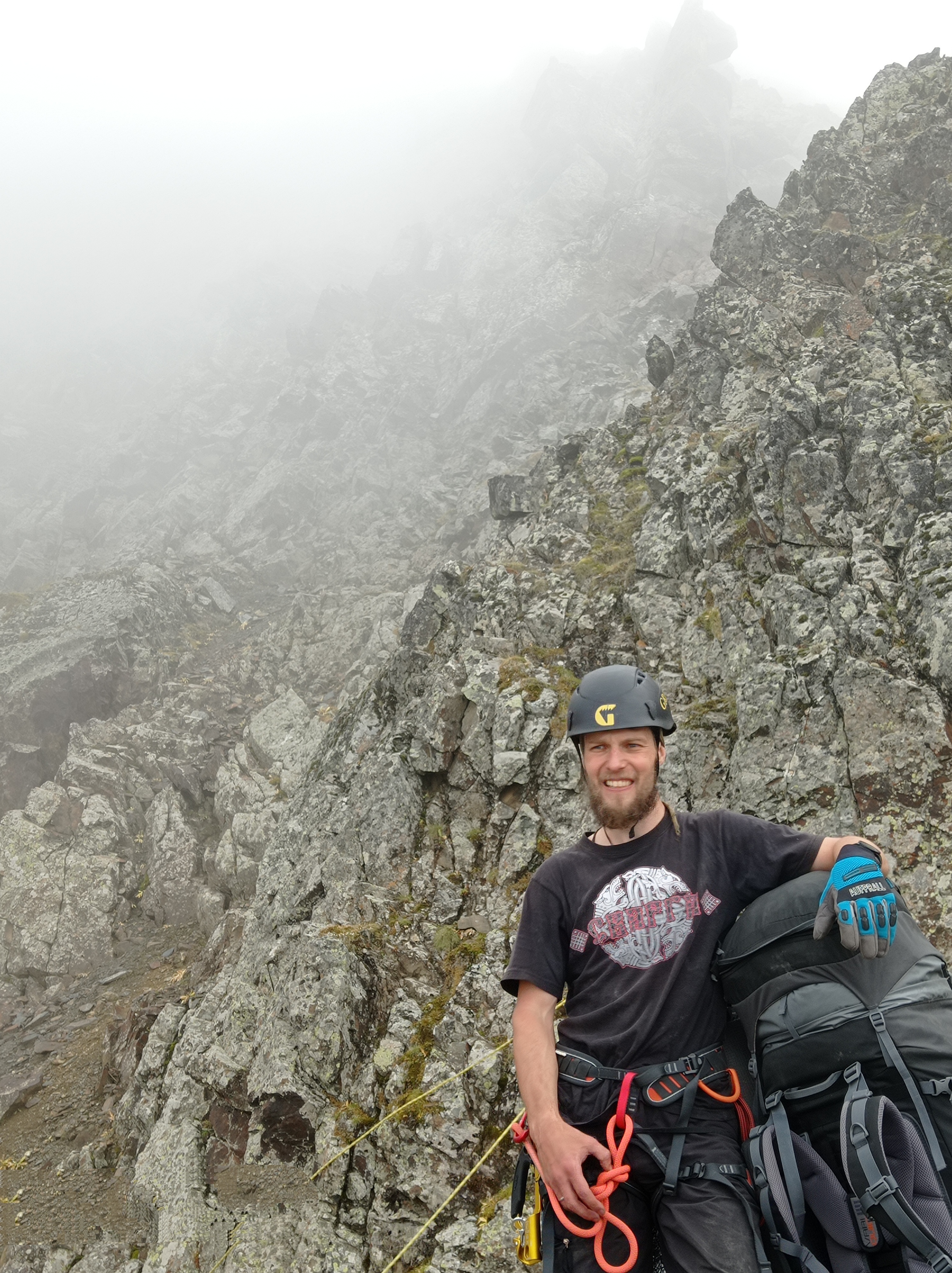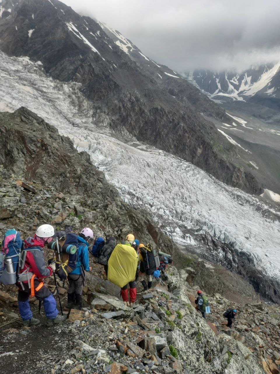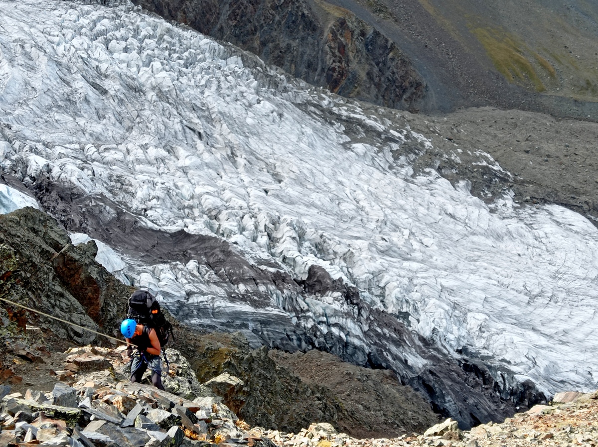 Снимаем кошки, убираем ледорубы и палки. Начинаем подъем по скальному контрофорсу