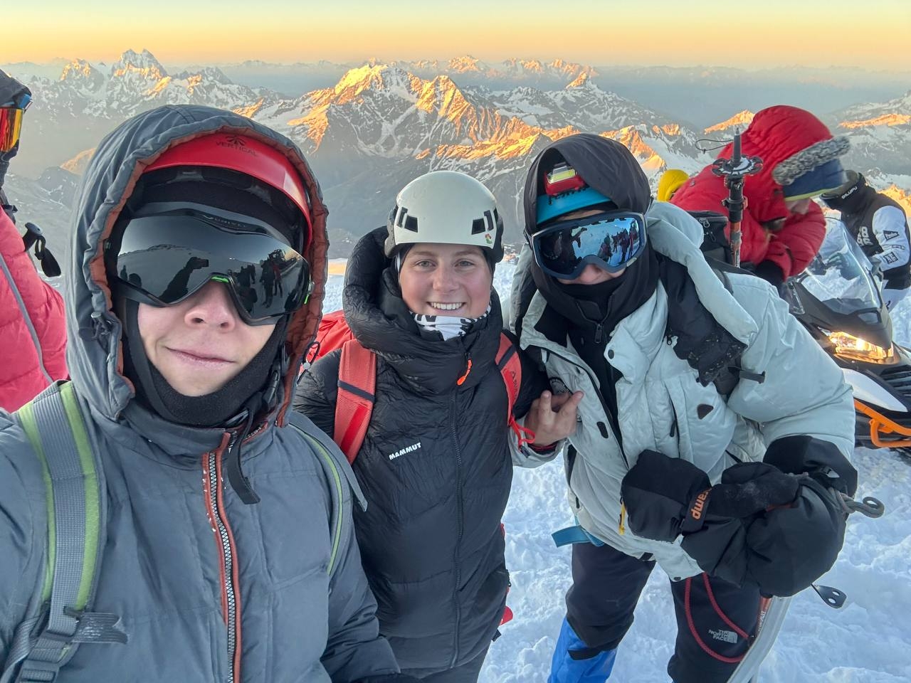 Начинаем подъем на западную вершину. Подходим к перилам. Встёгиваемся обоими усами. Дальнейший подъем идет с перильной страховкой. Группа идем плотным гуськом. Гиды помогают делать перестёжку. Прохождение перил занимает около 1,5 - 2 ч Чуть выше есть удобная площадка, где вся группа может собраться. Короткий привал 5-10 минут. Кому необходимо, пьют чай, изотоник. Впереди - последний участок - Тропа зомби. Проходится на одном дыхании. Впереди - возвышение. Это и есть высшая точка Европы. Последние шаги - и полный отрыв от всех земных притяжений. Вокруг: Космос, Горы, ликования друзей, с которыми вместе ты совершил это великое событие своей и их жизни.