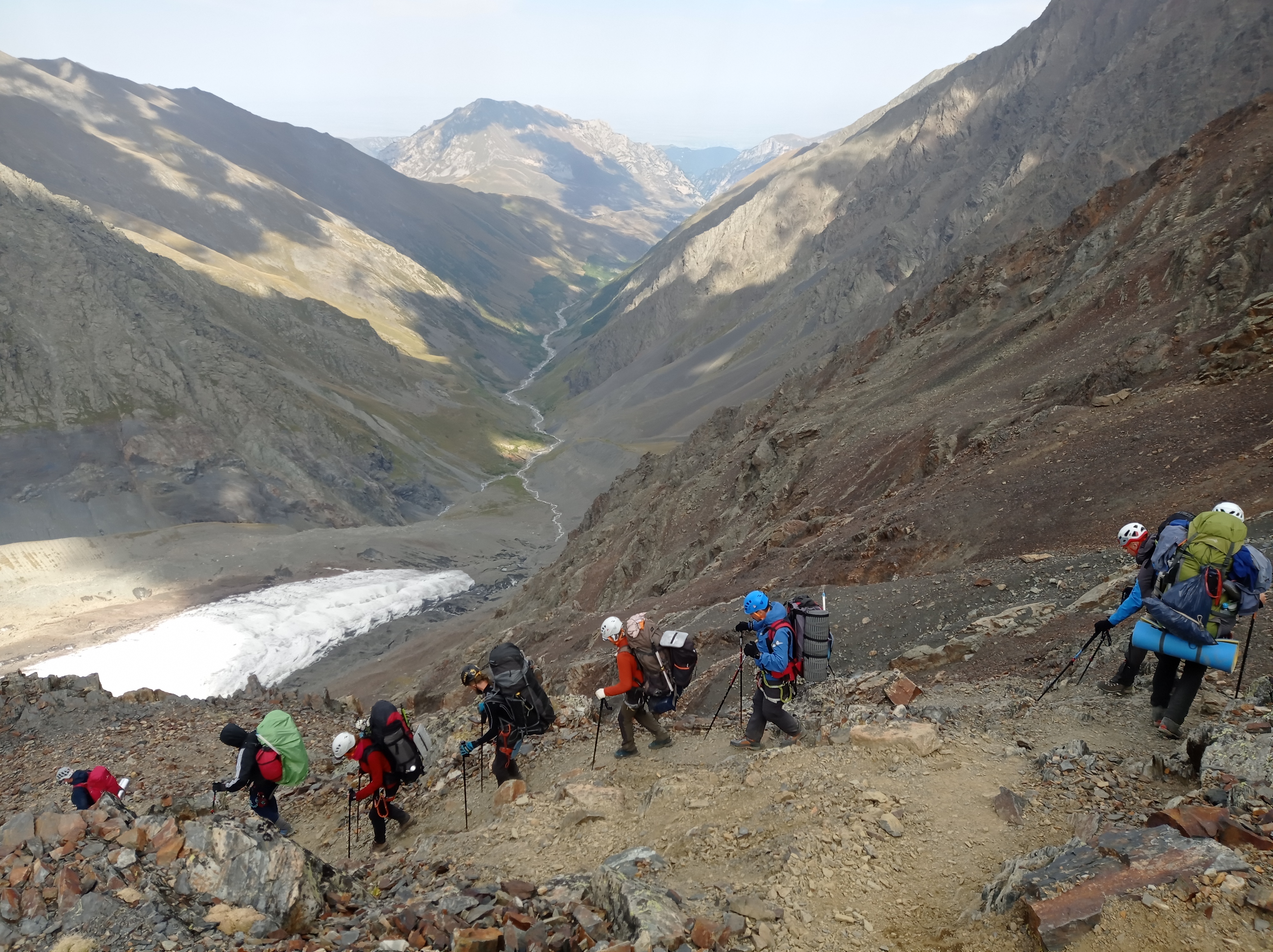 Утром продолжаем спуск. Буквально в 70 м под нами начинается скальный участок, где потребуется провешивание вертикальных перил для спуска дюльфером. Спуск проходит заметно легче, увереннее и быстрее подъема. Сказывается хорошая акклиматизация.