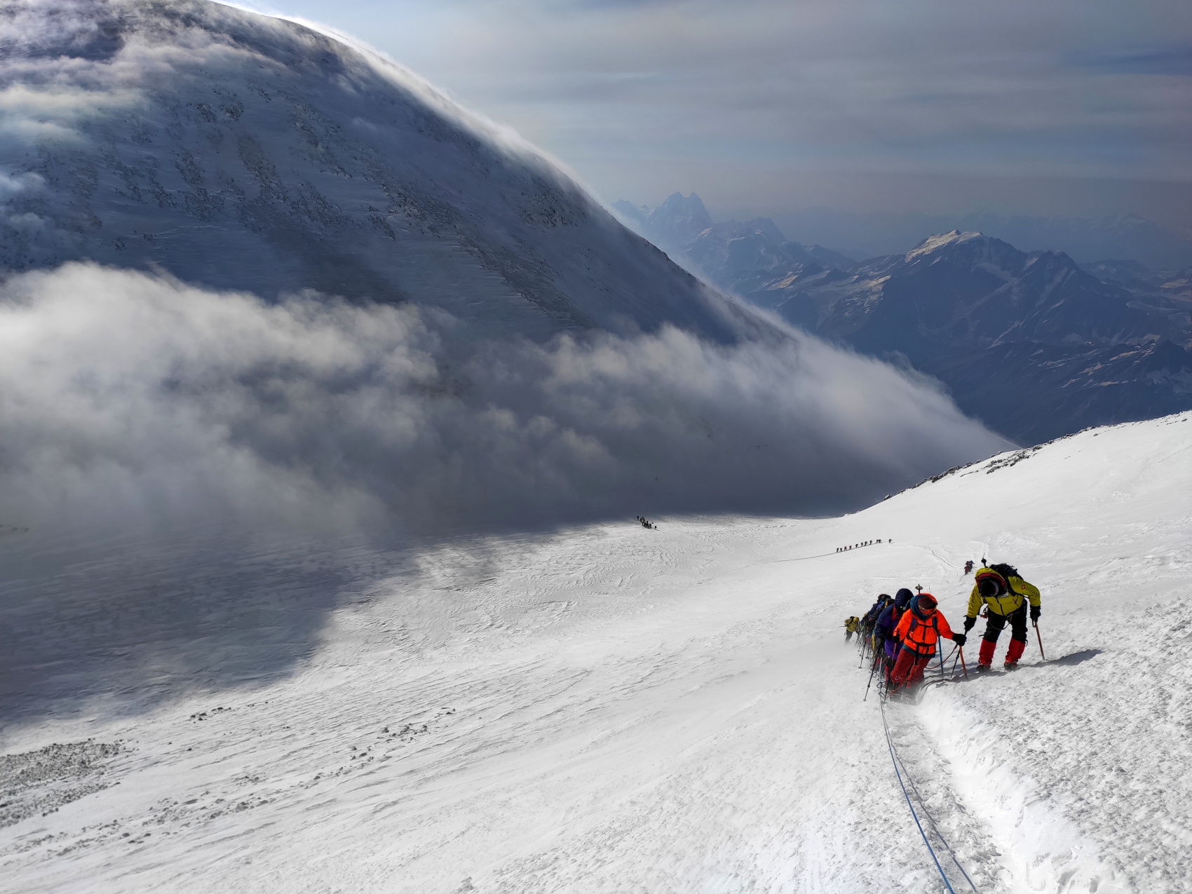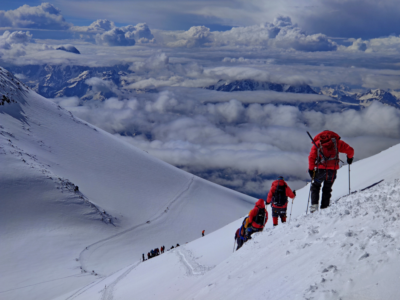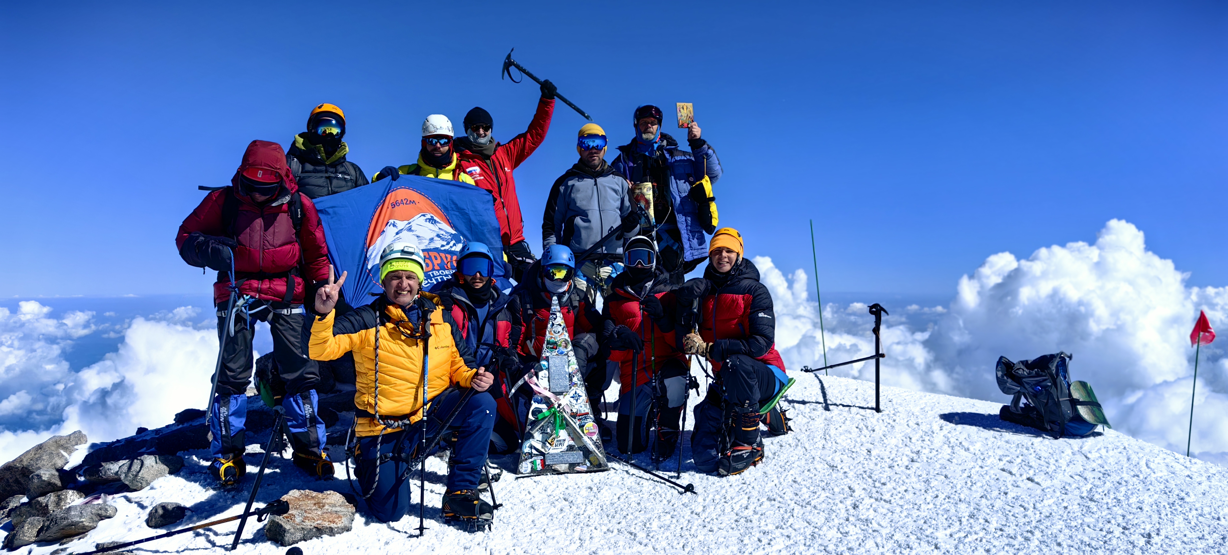 Эльбрус, высочайшая вершина Кавказа, России и Европы, высота Западной вершины 5642 метра, Восточной 5621 метр, при восхождении с Юга поднимаются на Западную вершину.