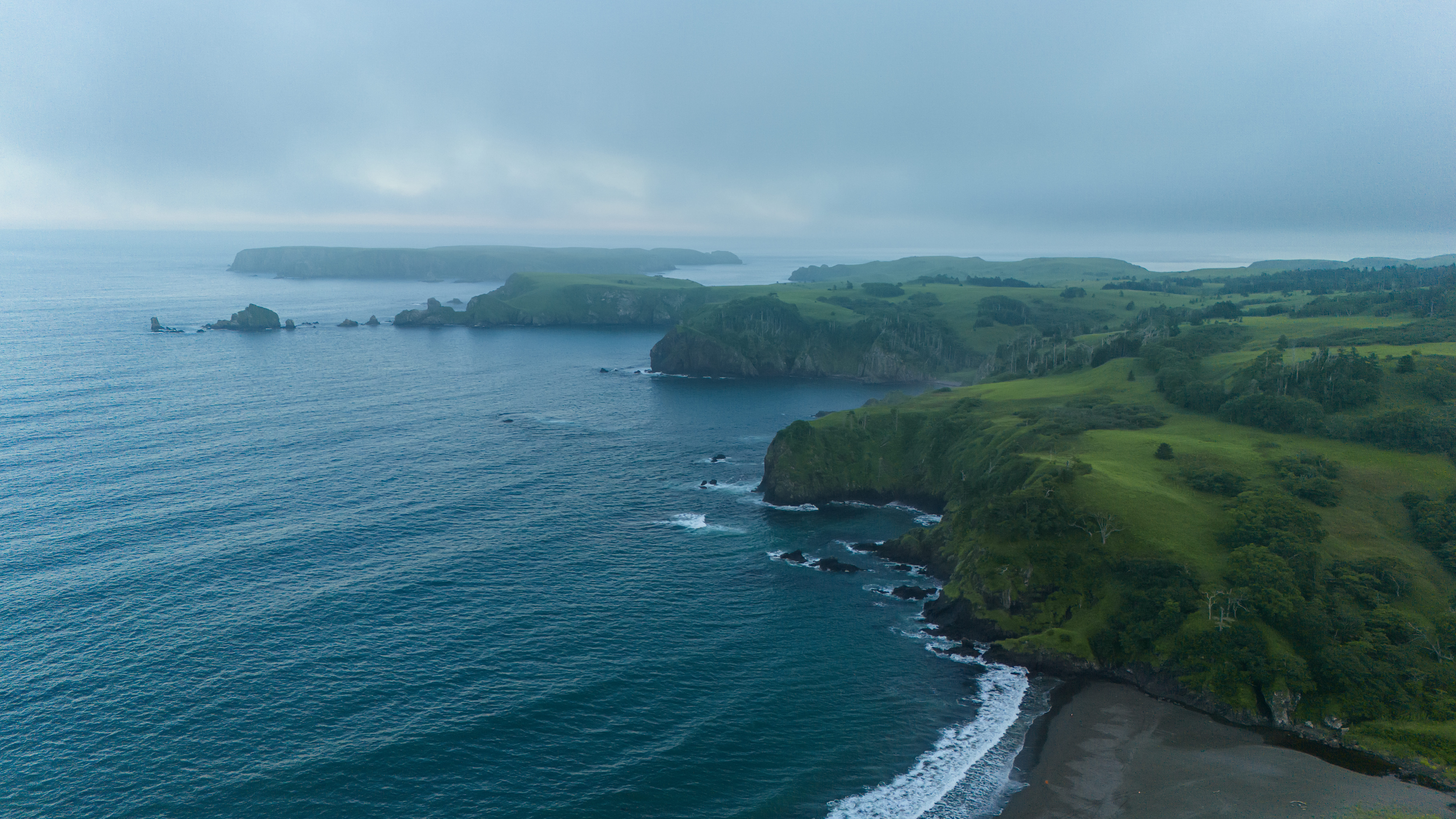 Приготовьтесь к захватывающему путешествию вдоль побережья Итурупа, где вас ждут поразительные контрасты природы от загадочных черных пляжей до ослепительно белых скал, от бушующего океана до умиротворяющих геотермальных источников.