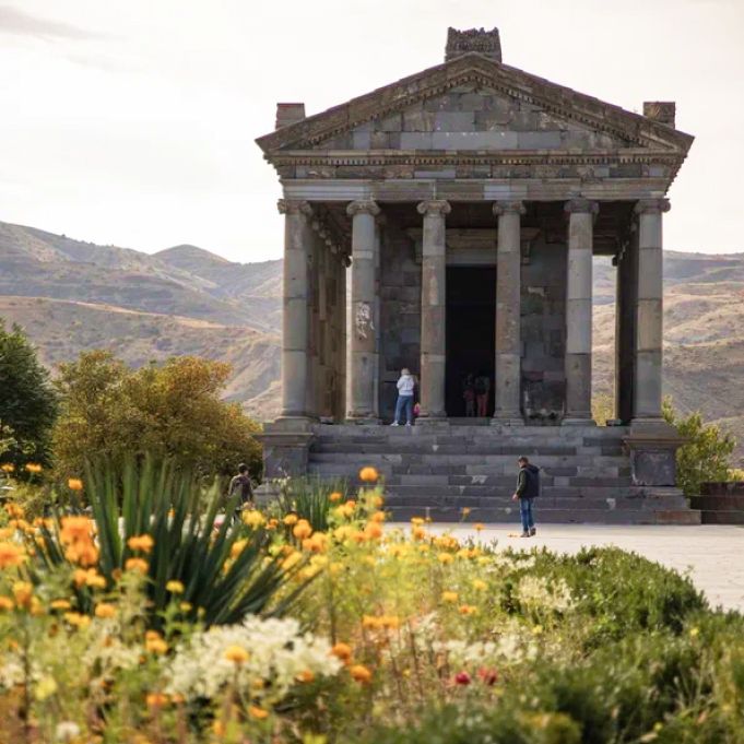 - Начнем с языческого Гарни -посвященный Богу Солнца. Это некий армянский Акрополь. Вас поразит удивительная гармония природы и храма: окружающие горы с крутыми обрывами каньона реки Азат словно держат в ладонях этот статный храм.