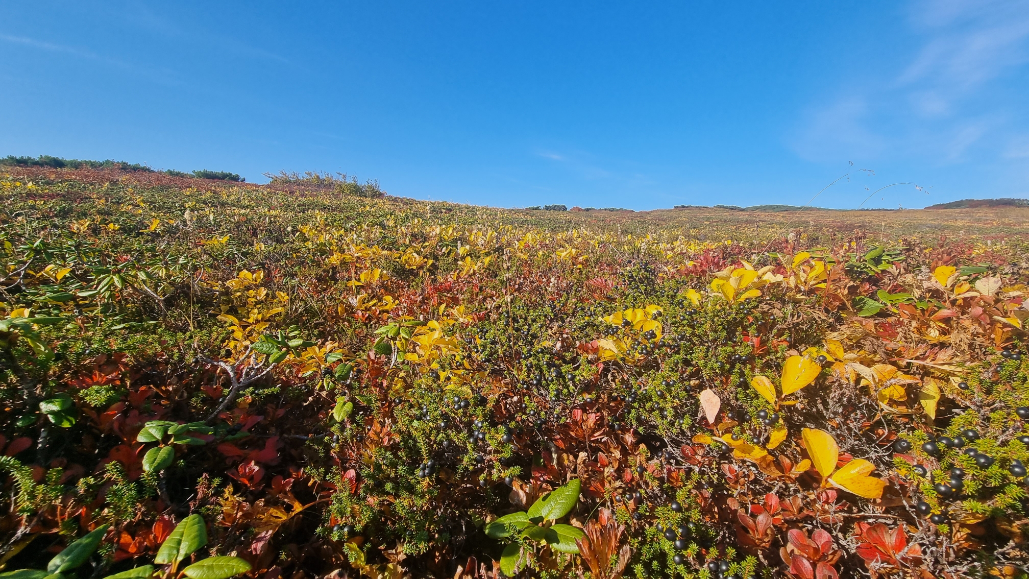 Около 13:00 переезжаем к Вилючинскому перевалу (высота более 800 метров над уровнем моря). С высоты перевала открываются потрясающие виды на Вилючинский вулкан и окружающую альпийскую растительность, а в ясную погоду открываются виды на вулканы Мутновский, Горелый, Опала и Апача.