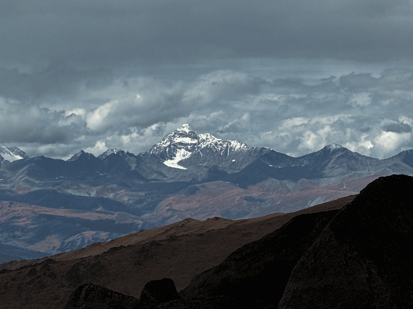 Остроконечная Иикту (3936 м) и весь Южно-Чуйский хребет на северо-востоке.