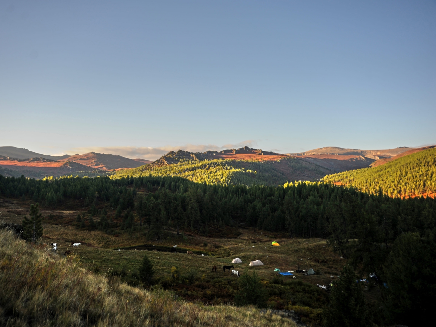 На пути леса и броды сменятся открытыми долинами, трава под копытами станет короче, воздух — свежее. Лес останется позади, и мы выйдем на 2100 м н.у.м. — это ещё не Чокпорташ, но здесь мы заночуем, чтобы завтра продолжить путь.