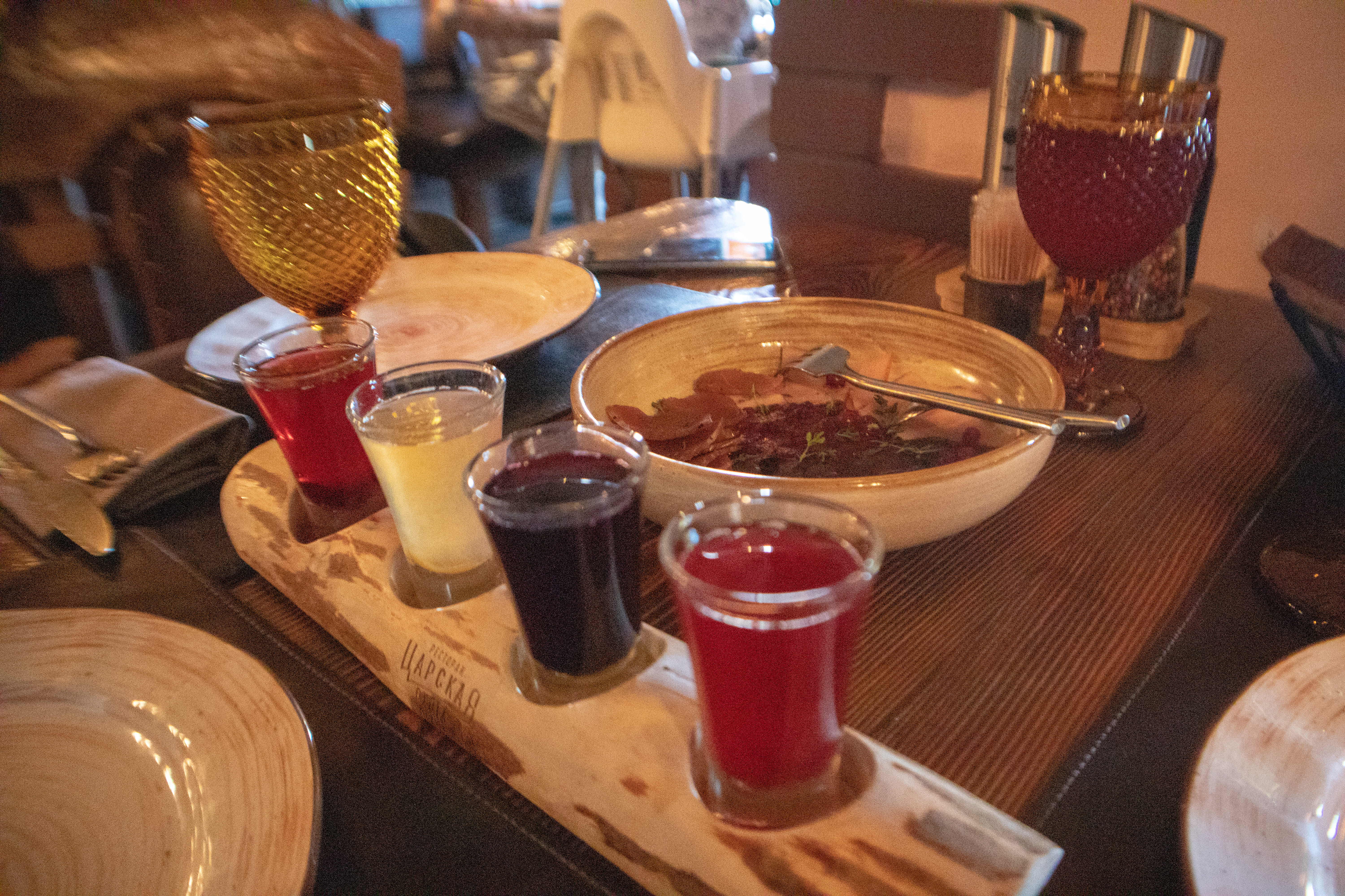 • Из тундры: сыровяленый олень, подкопченное мясо глухаря, сыровяленое мясо лося. Арктическая уха. Оленина в брусничном взваре с пюре, десерт Морошка&Кедр, брусничный морс 0,2, сет из настоек: черника, брусника, морошка, малина. Хлебная корзина.