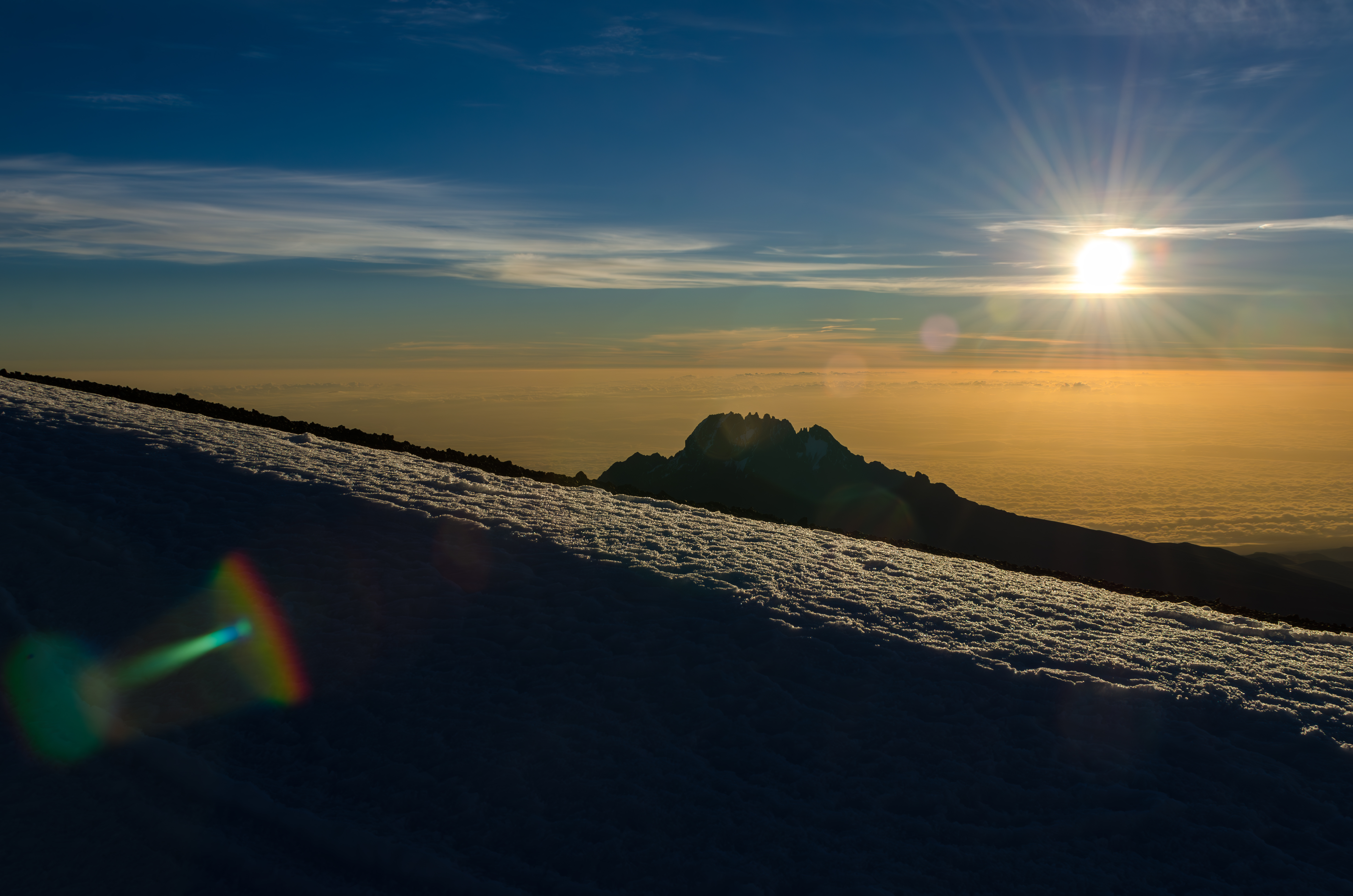 На сегодняшнее утро у нас назначен подвиг! Ранний подъем в 0100, горячий чай, легкий перекус и вперед к вершине. Идем не торопясь с остановками. Встречаем рассвет на Гиллманс Пойнт (5 685 м) и это уже первая вершина, кромка кратера, отсюда можно возвращаться вниз.