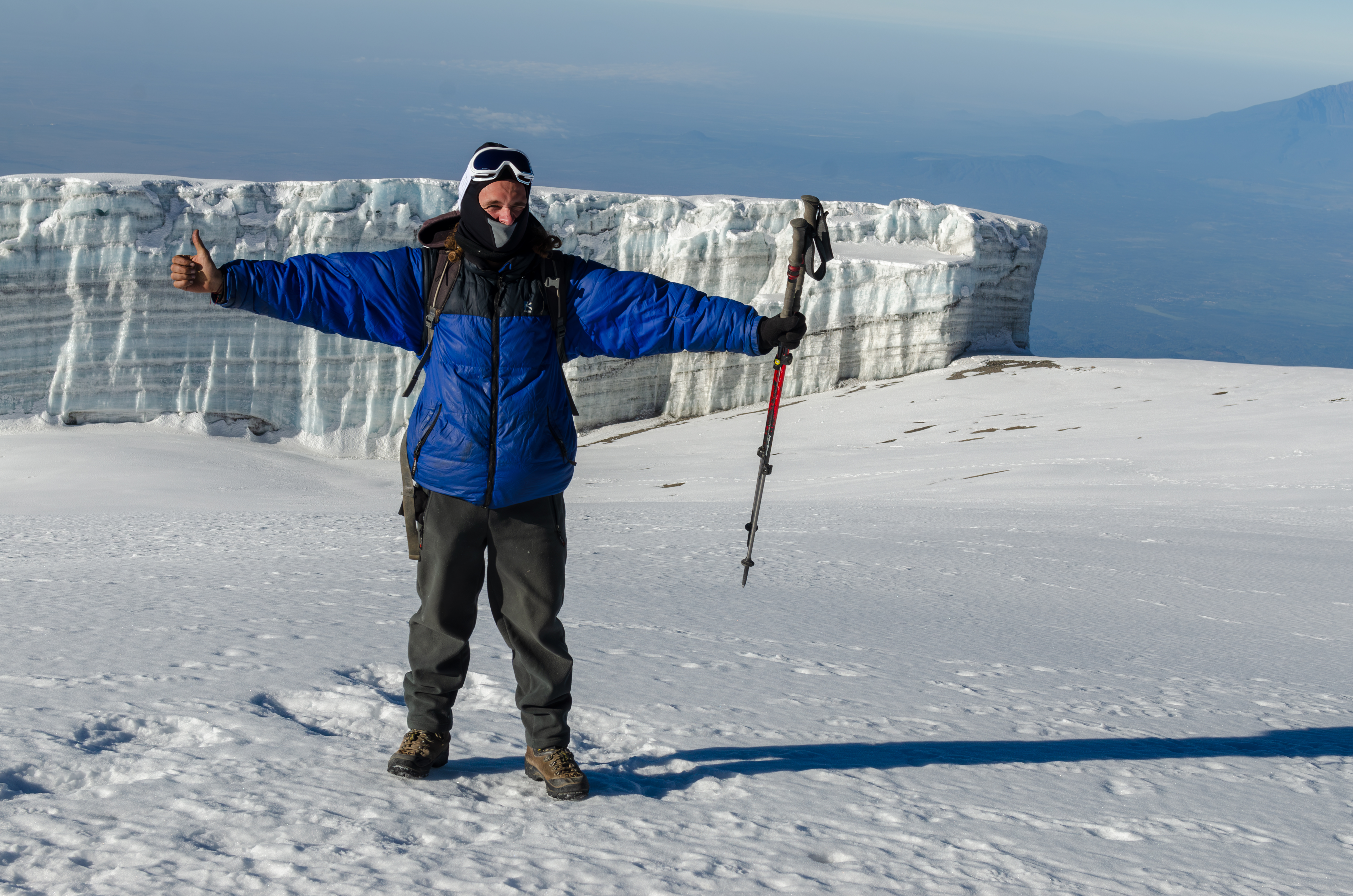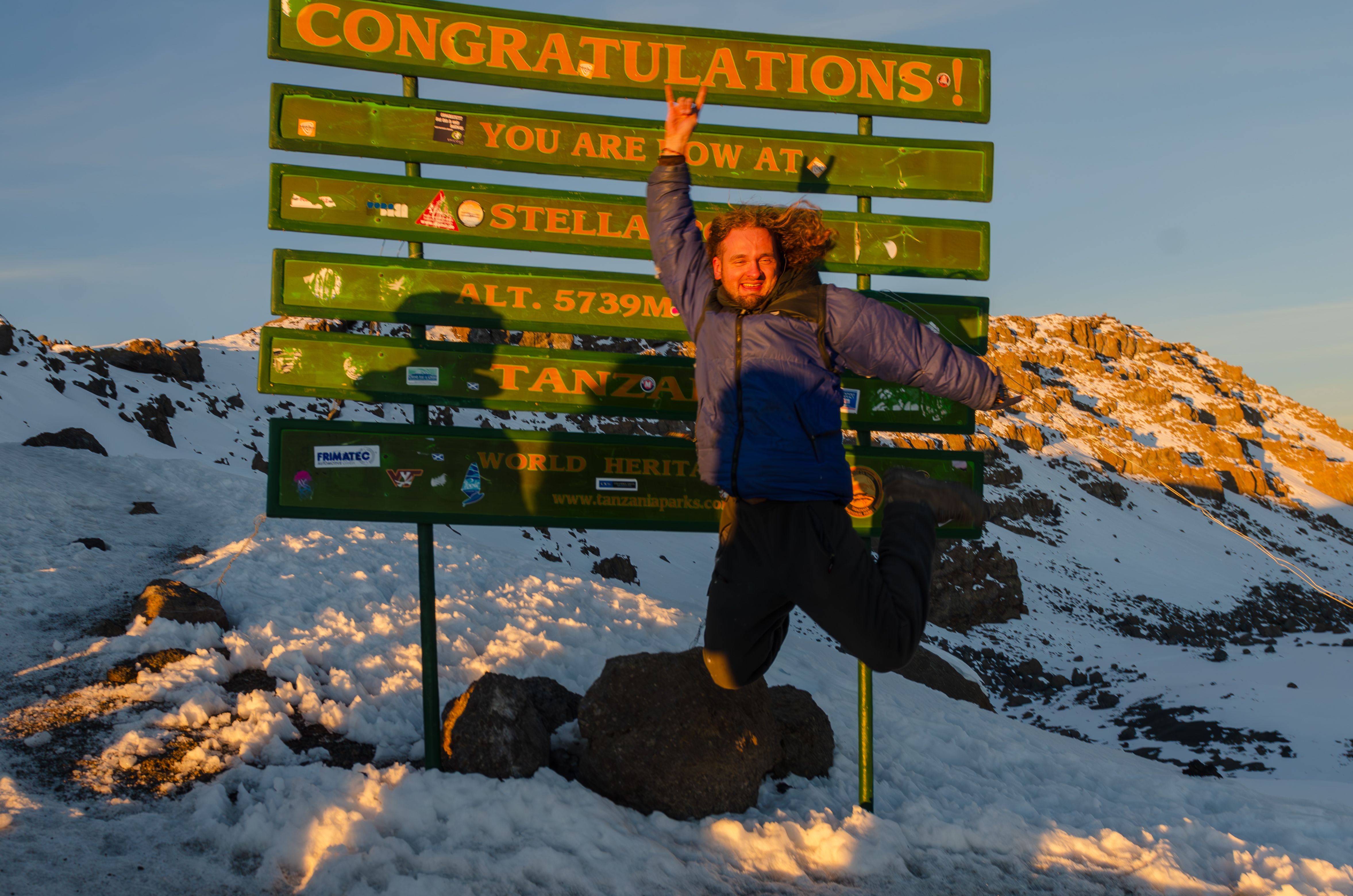 Для тех, у кого все еще остались силы, несложный подъем по кромке кратера Кибо к пику Ухуру (5 895 м) и вот он вкус победы!! Фотографируемся у знаменательных табличек и у остатков древнего ледника причудливой формы.