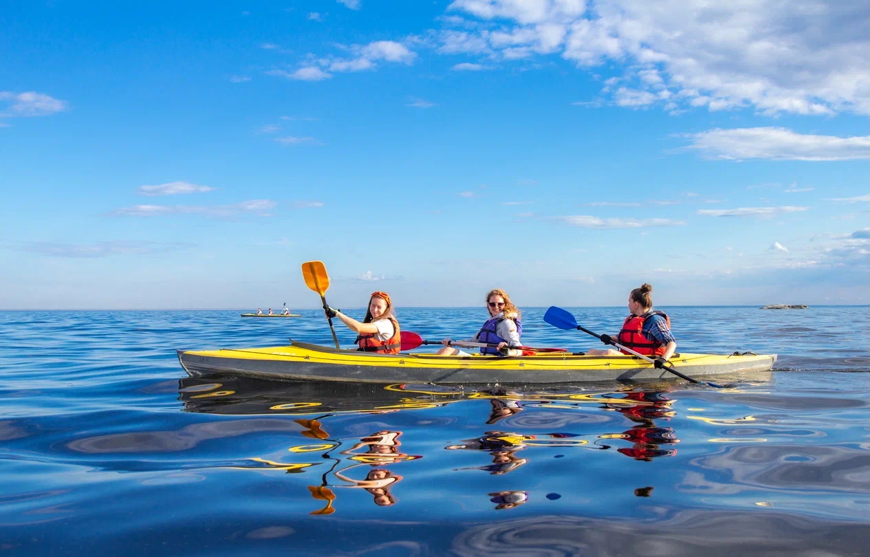 Поход проходит среди шхер — скалистых островков, закрывающих нас от ветра. Это не только красиво, но и комфортно. Идём на современных каркасных байдарках с защитными юбками и гермомешками — всё удобно, безопасно и продумано. Специальная подготовка не нужна — покажем, расскажем и научим прямо на месте.