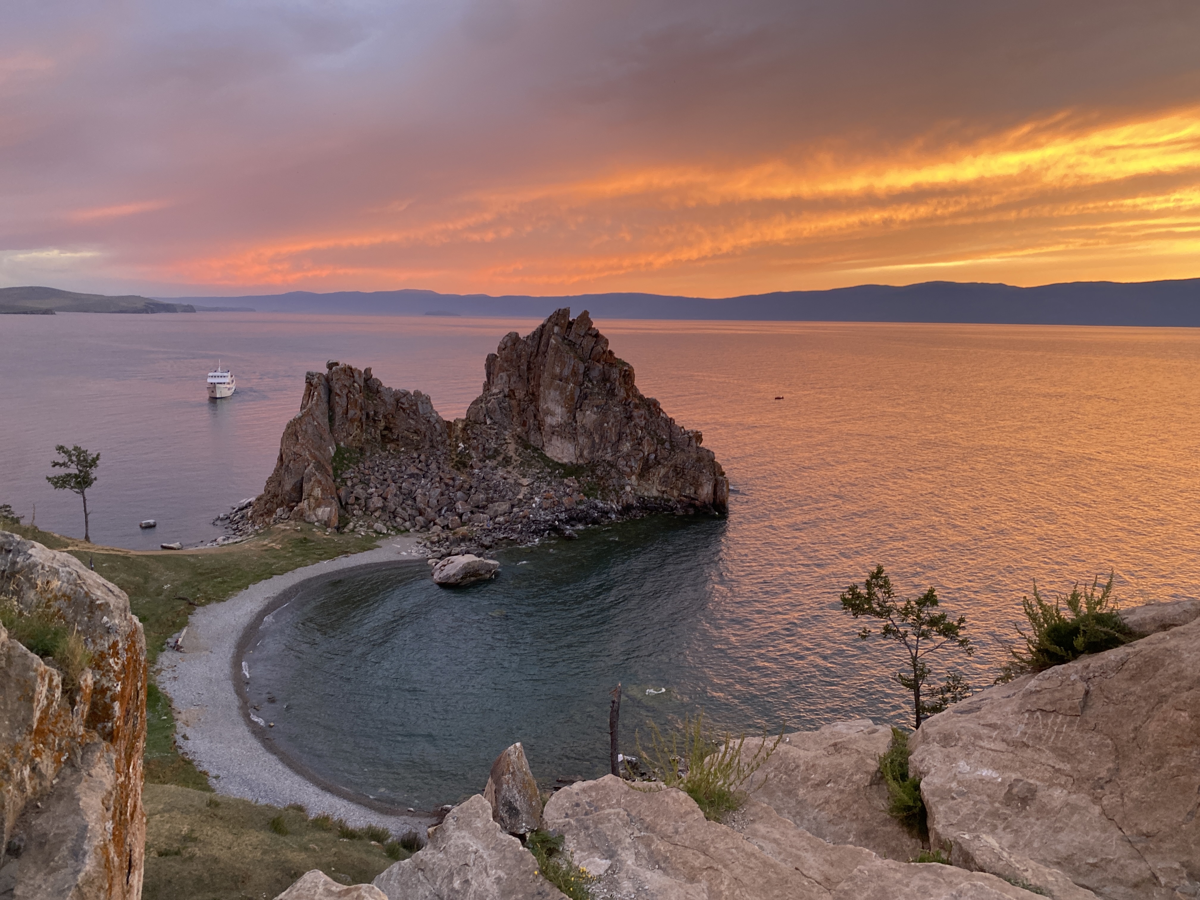 Это момент, когда вы замолкаете. Без шуток. Огромный шаманский утес, солнце садится в воду, последние лучи золотят скалы. Фотографии не передадут. Это надо чувствовать.