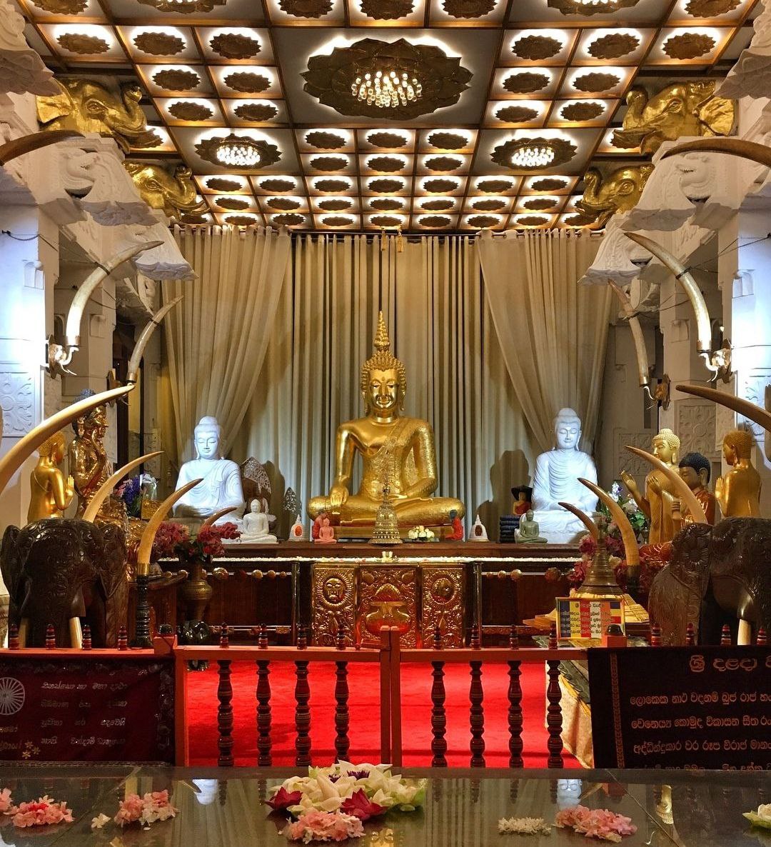 Храм Священного Зуба Будды в Канди. Одна из самых почитаемых буддийских святынь. В этом храме хранится ступа с зубом Будды, который стал объектом паломничества для миллионов людей со всего мира. Среди друггих достопримечательностей храма — несколько драгоценных статуй Будды из изумруда, горного хрусталя и нефрита, золотой Будда, собрание древнейших рукописных книг. Зуб Будды хранится в серебряном ларце, который можно увидеть на протяжении 15 минут каждый день.