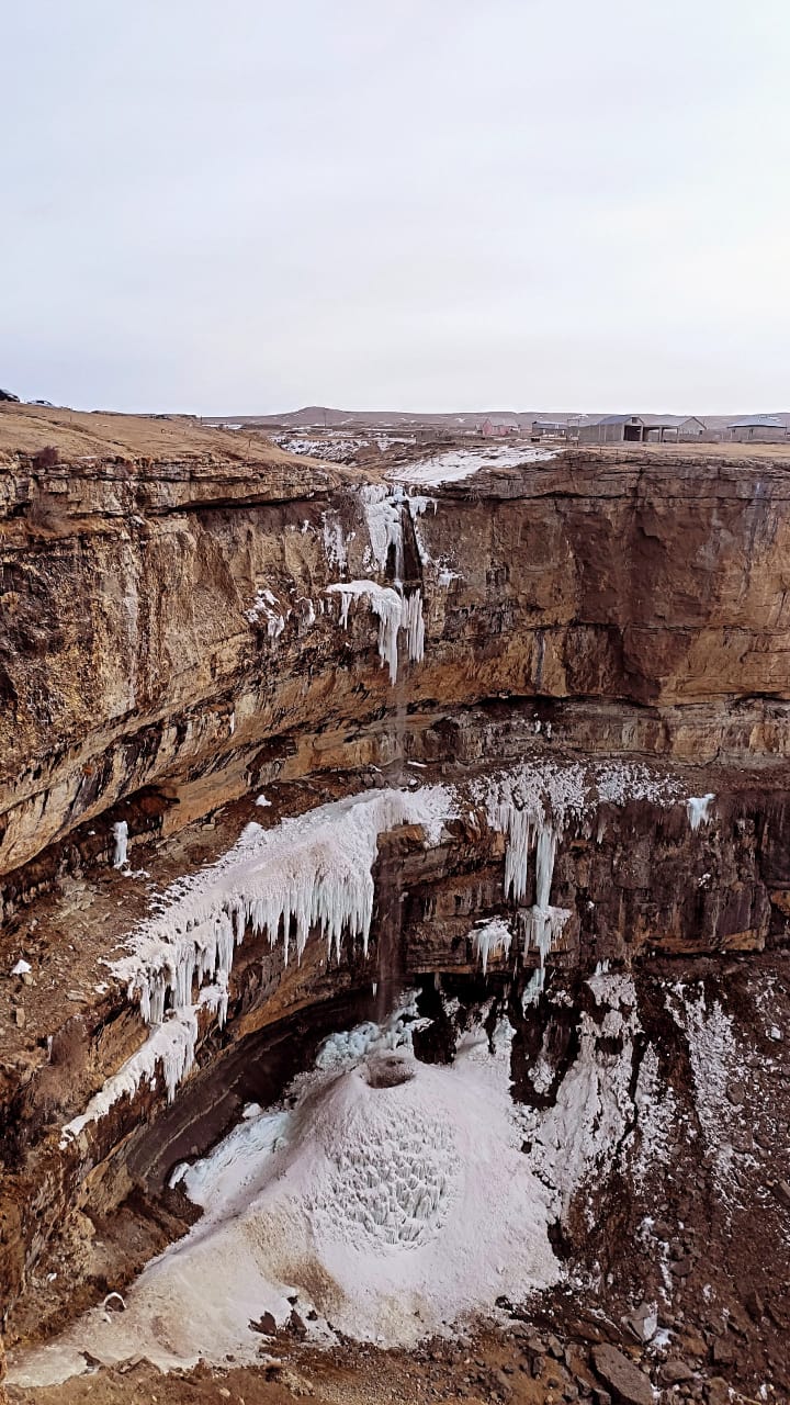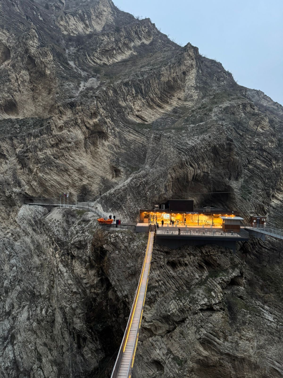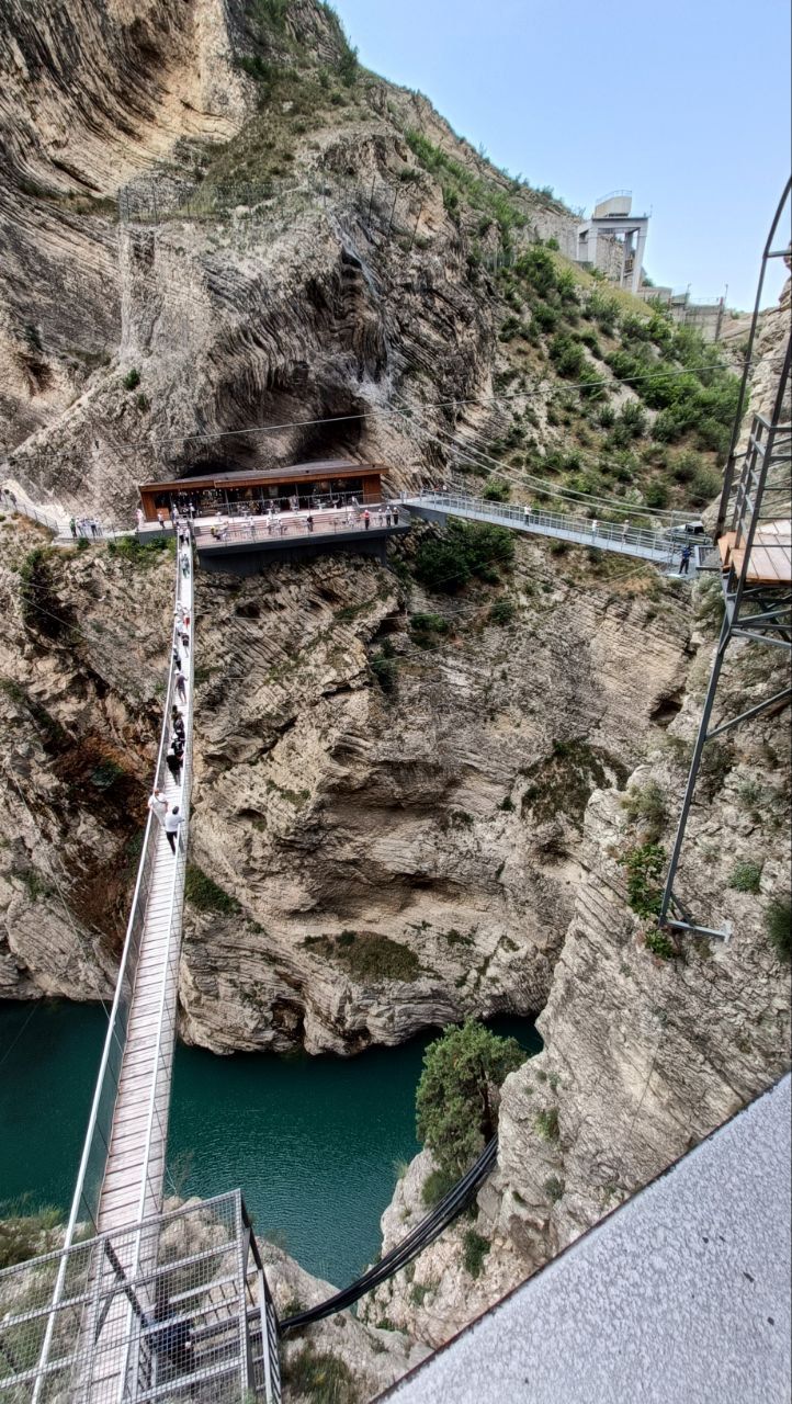 Это комплекс рукотворных пещер соединенные между собой подвесным мостом на высоте 80 м над водой в конце Сулакского каньона.
