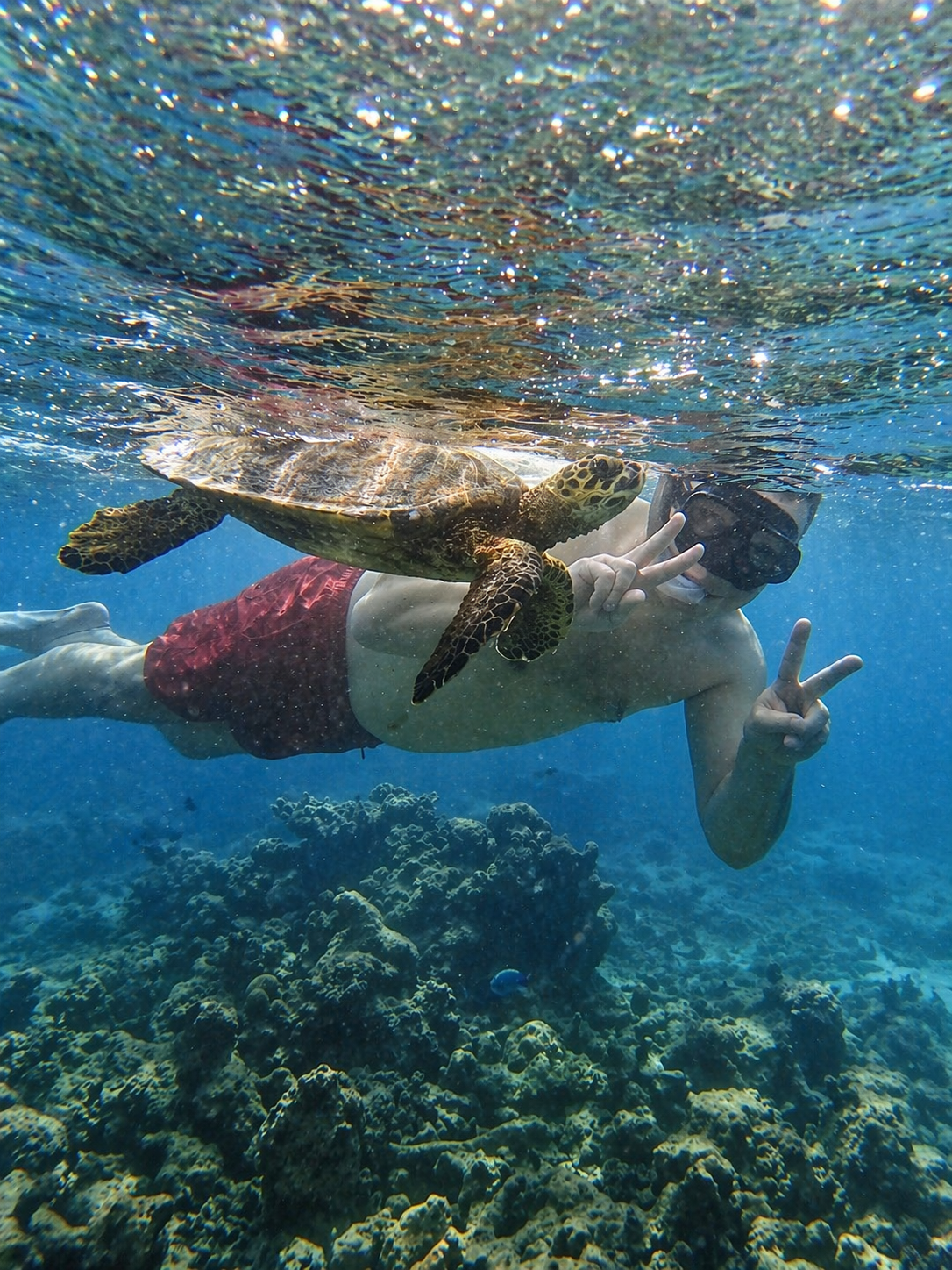 Под водой — невероятно красивый, живой мир: структурные кораллы, глубина оттенков, красочные стай рыб. Черепахи, которые не боятся и позволяют подплыть достаточно близко.