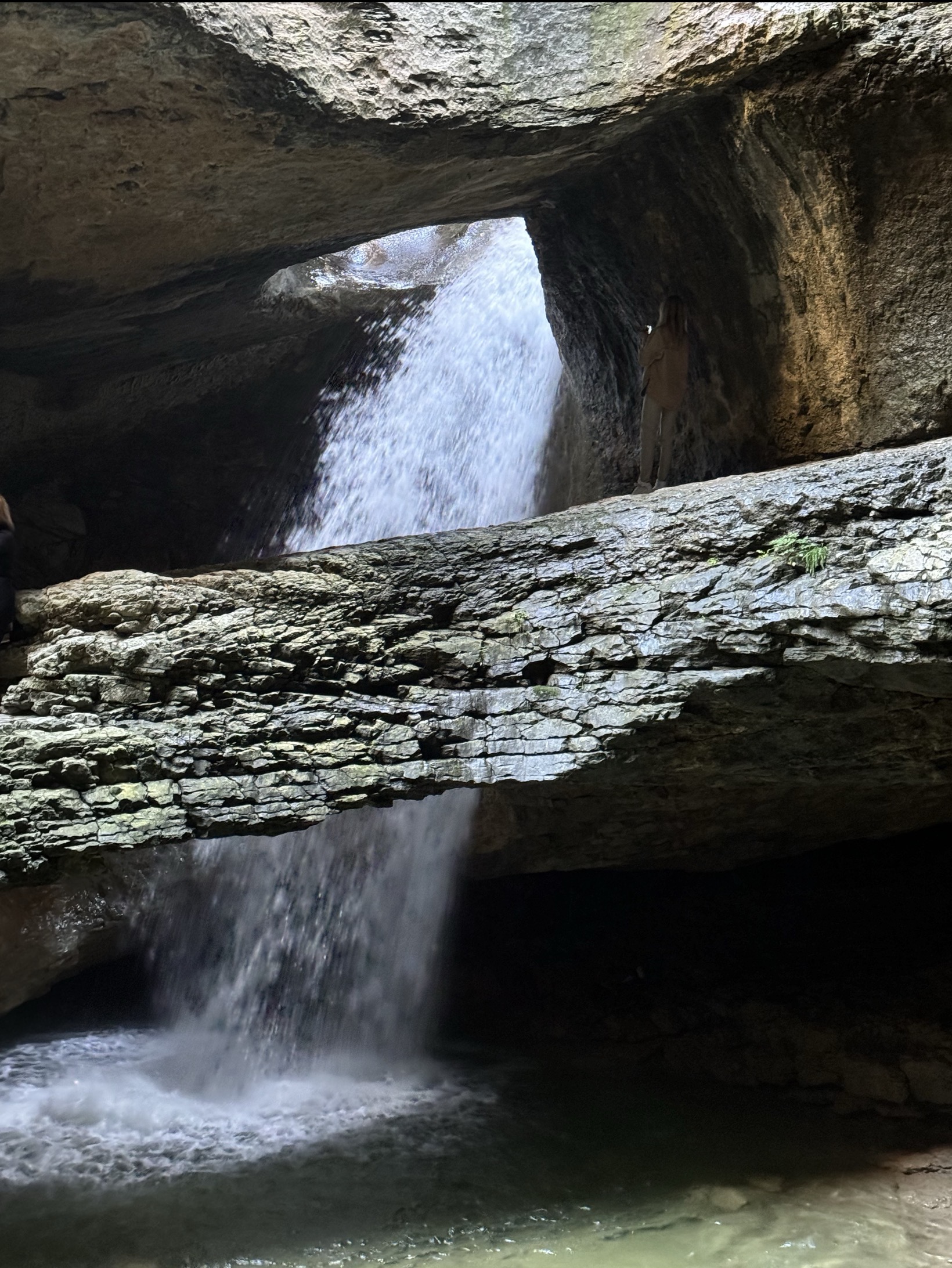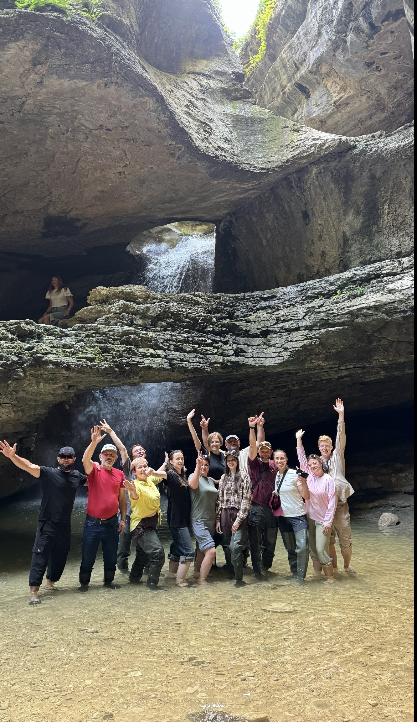 Если сезон позволяет, мы увидим Салтинский подземный водопад. Вода падает сквозь свод пещеры, капли звенят, воздух влажный и прохладный. Это словно сцена из фильма — только вы внутри неё.
