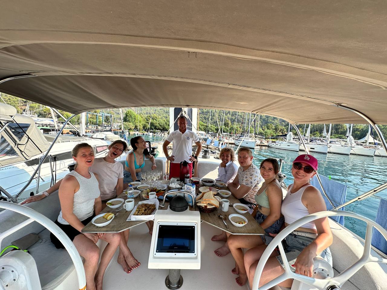 Обычно завтрак и обед проходят на яхте. Мы закупаем продукты с учетом ваших пожеланий и вкусовых предпочтений на неделю. Капитан готовит самостоятельно, но любая помощь ему всегда приветствуется. Это сделано для удобства, чтобы не бегать с утра в поисках команды и не готовиться долго к отплытию. Всегда можно согласовать завтраки и ужины в понравившимся месте и сходить туда.