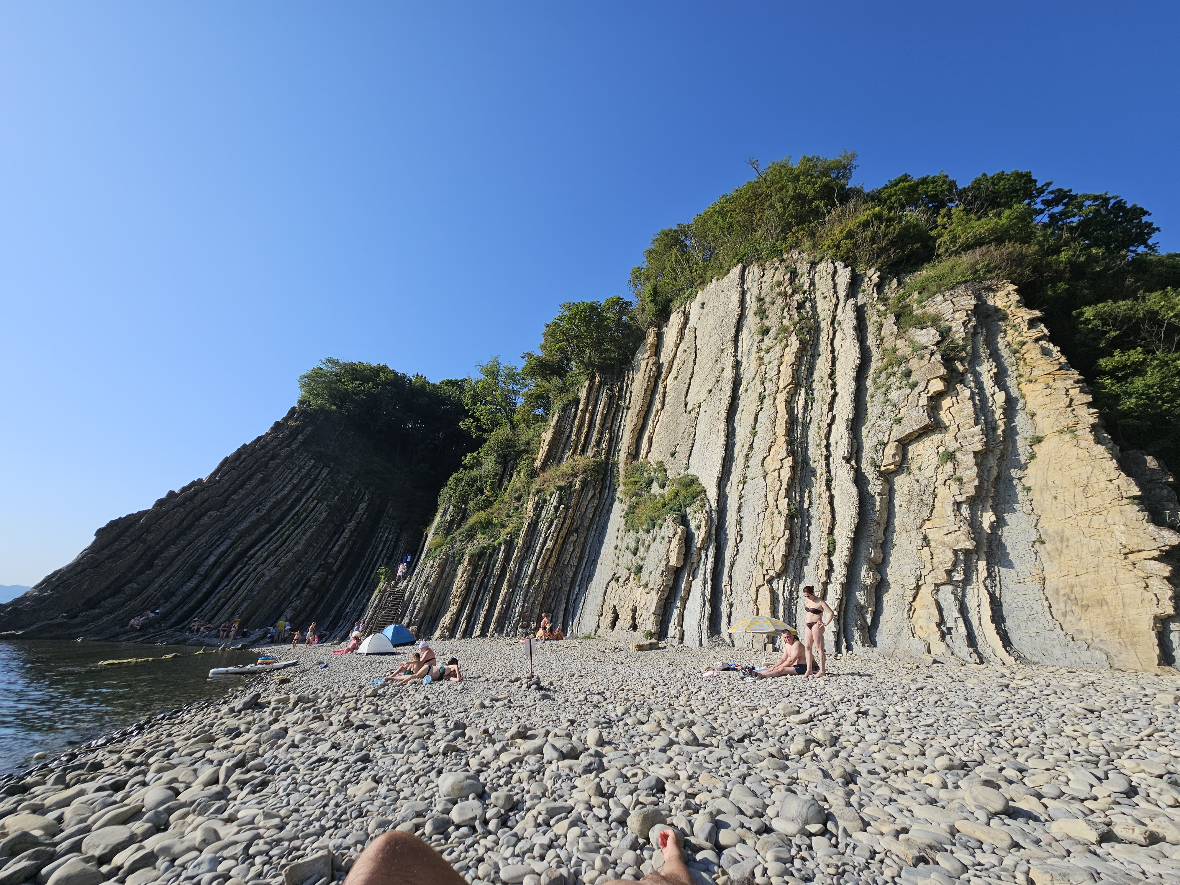 Мы аккуратно спустимся к подножию — прямо на галечный пляж, укрытый скалой.