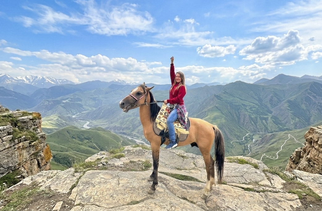 Видовая прогулка на лошадях: Ваше знакомство с Дагестаном начнется с тест-драйва настоящего горного транспорта - лошадей. Здесь не потребуются навыки наездника - просто доверьтесь моменту. Ваш путь пройдет через яблоневые и абрикосовые сады к берегу горной реки. Мерный шаг обученных лошадей настроит на нужный лад, а завершением маршрута станет травяной чай на дровах под шепот речки в тенистом саду.