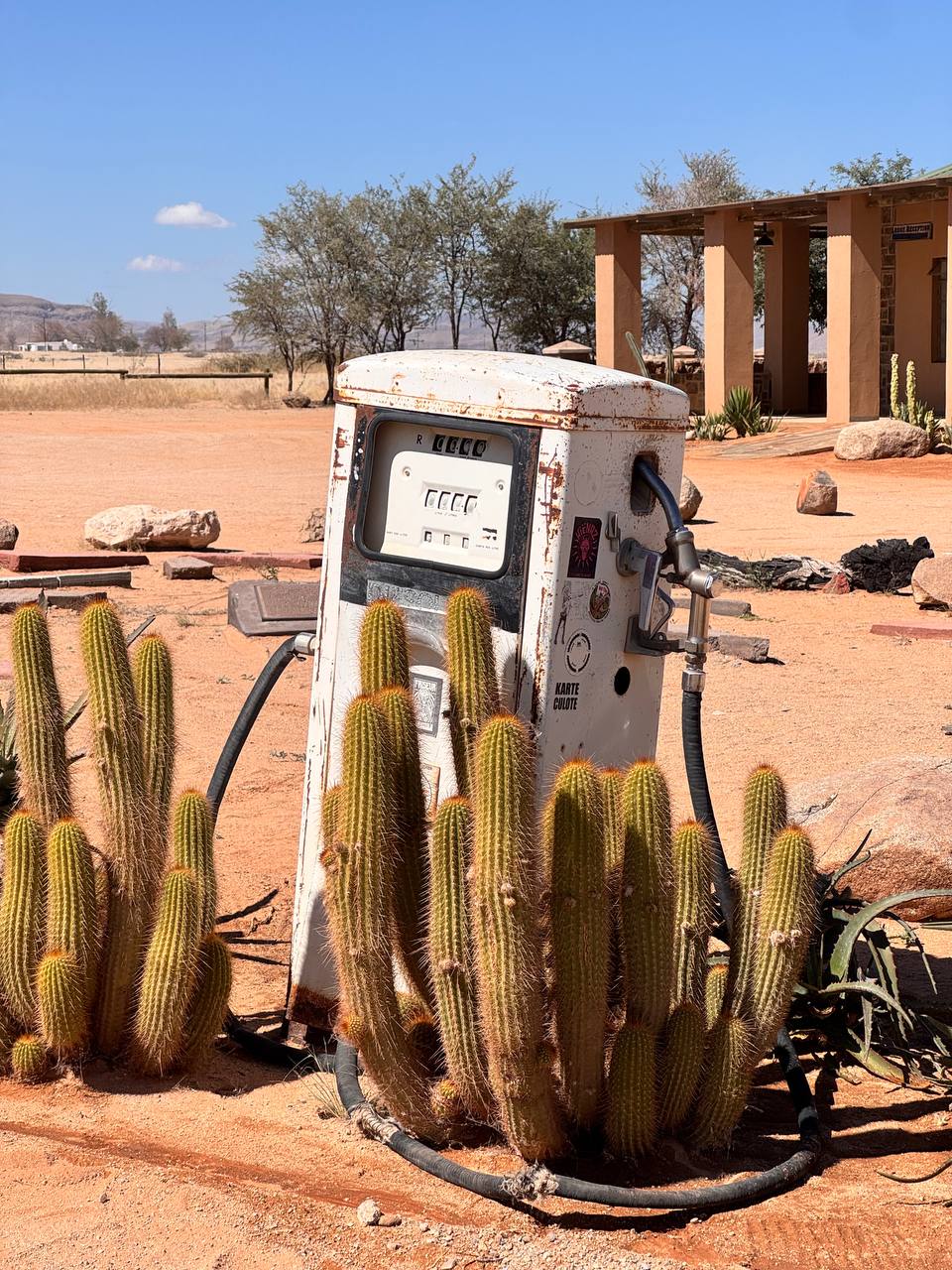 После прогулки продолжаем путь в сторону Виндхука. Пейзажи постепенно меняются — от красных камней и пустынных долин к мягким холмам центральной части страны. По пути делаем короткие остановки на заправках и смотровых точках.