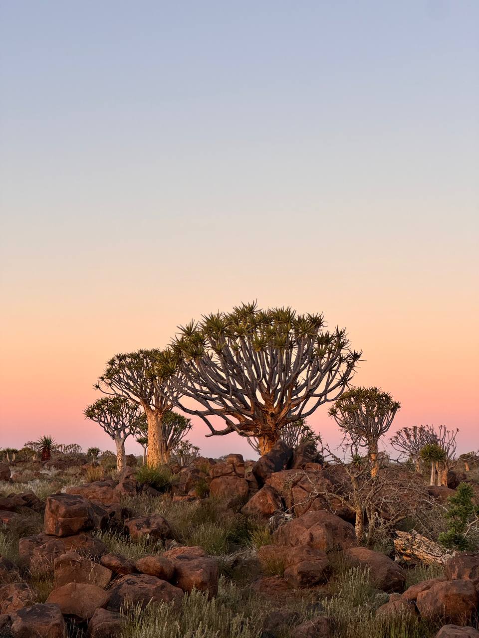 Утро начинаем рядом с Кейтмансхупом — здесь находится одна из самых необычных природных зон южной Намибии. Первая остановка — лес колчановых деревьев (Quiver Tree Forest). Это место кажется нереальным: десятки причудливых деревьев с гладкими золотистыми ветвями стоят посреди каменистой пустыни, создавая почти инопланетный пейзаж. Раннее утро делает свет мягким, фотографии получаются особенно атмосферными. Спокойно гуляем между деревьями, слушаем ветер и тишину — Намибия в своём медленном, красивом ритме.