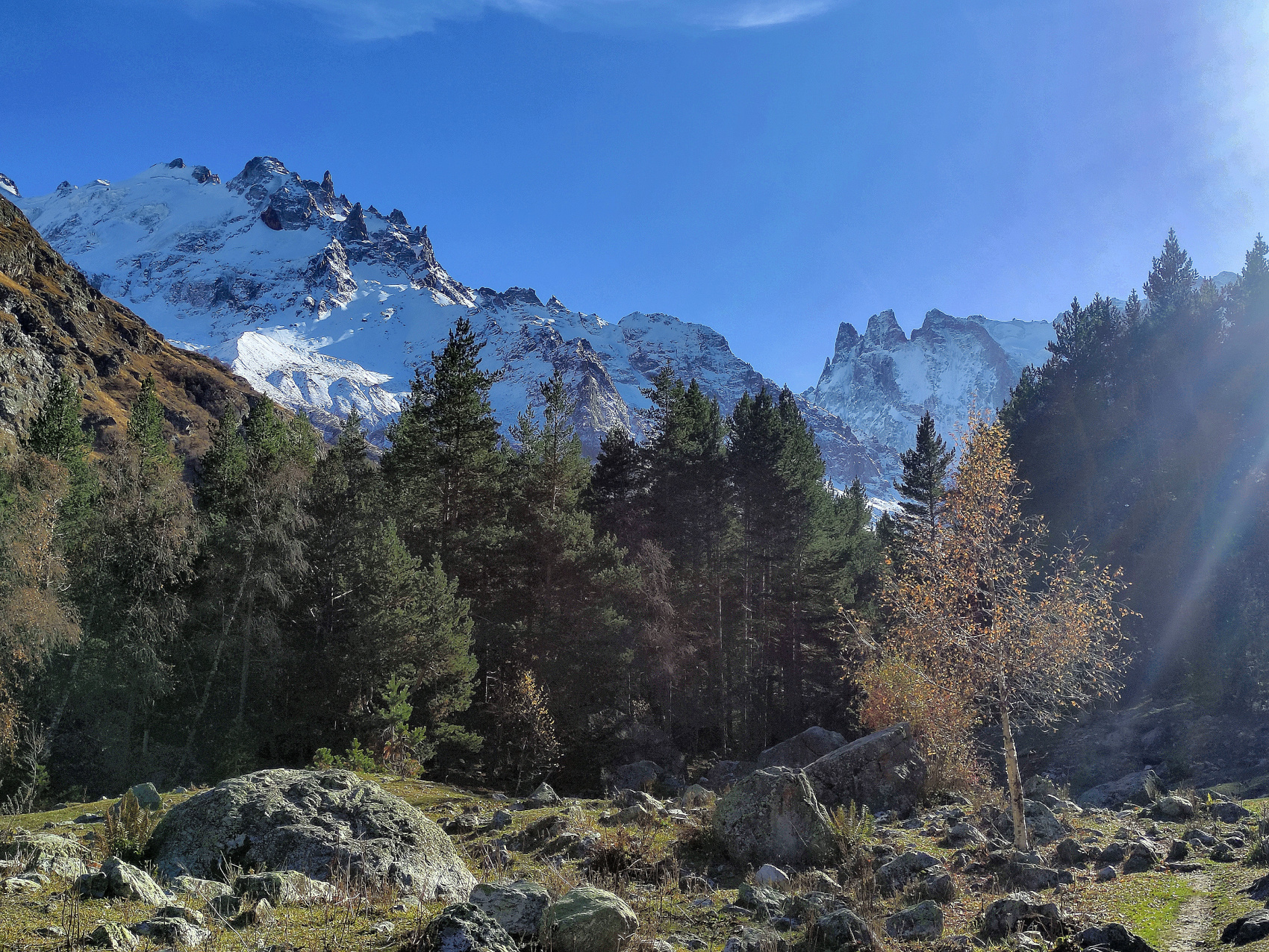 мы отправляемся вдоль реки Шхельда по одноимённому ущелью выше, к невероятным величественным вершинам. При хорошем темпе сможем добраться до ледника, располагающегося в верховьях ущелья. Но конечно нам важна не столько конечная точка, как сам маршрут. Идём неспешно, останавливаясь на фото привалы и конечно же нас ждёт сытный обед в ущелье)