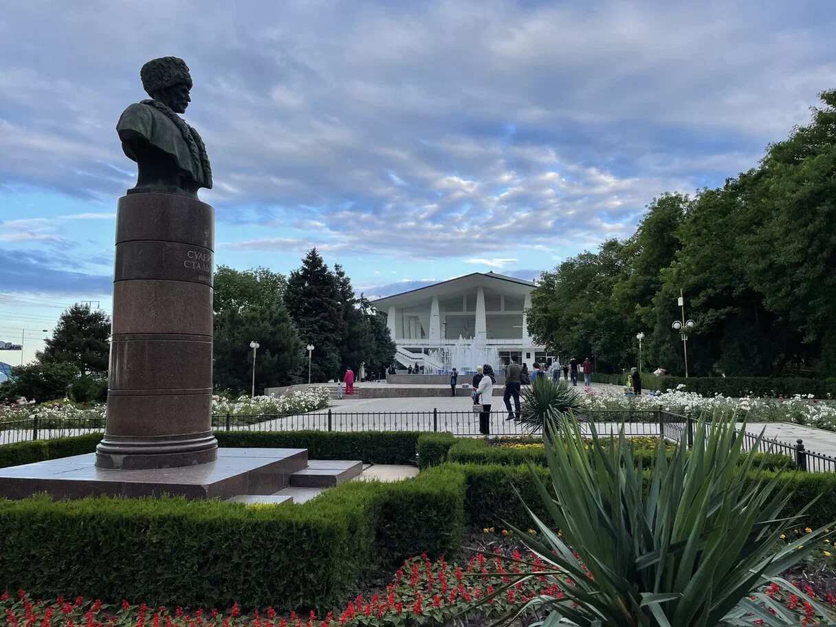 В аэропорту Махачкалы — напротив терминала А, у памятника Ахмет-Хану Султану