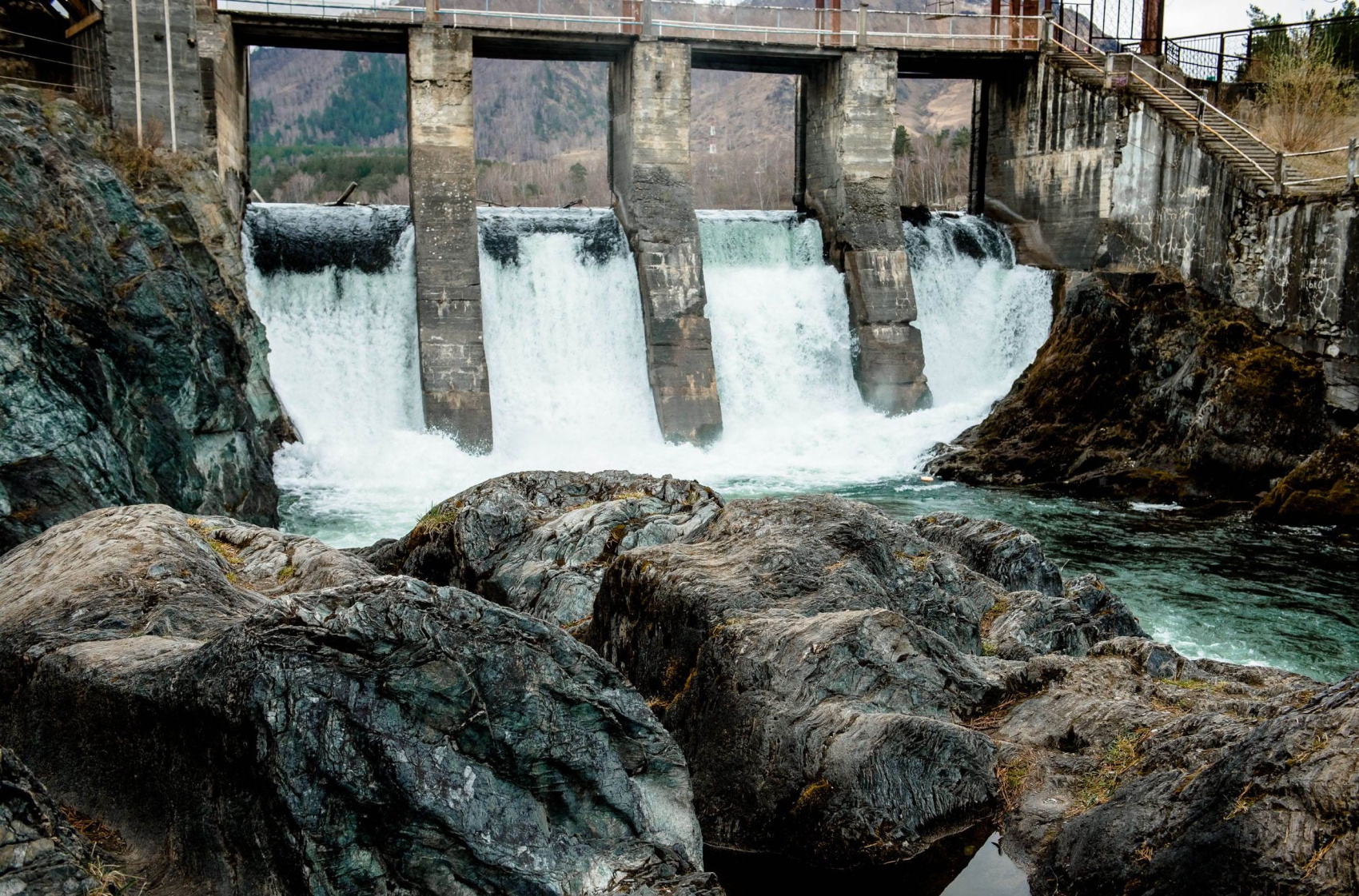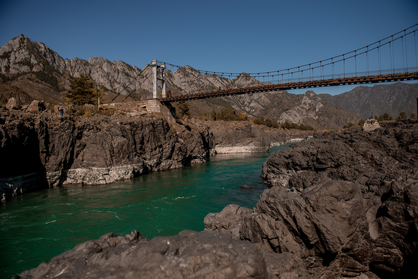 Далее едем в сторону Ороктойского моста. С него открывается вид на пороги Тельдекпень. Пороги представляют собой коридор из скал, через который проходит быстрый речной поток с водоворотами и подводными течениями. Здесь самое глубокое и узкое место реки Катунь.