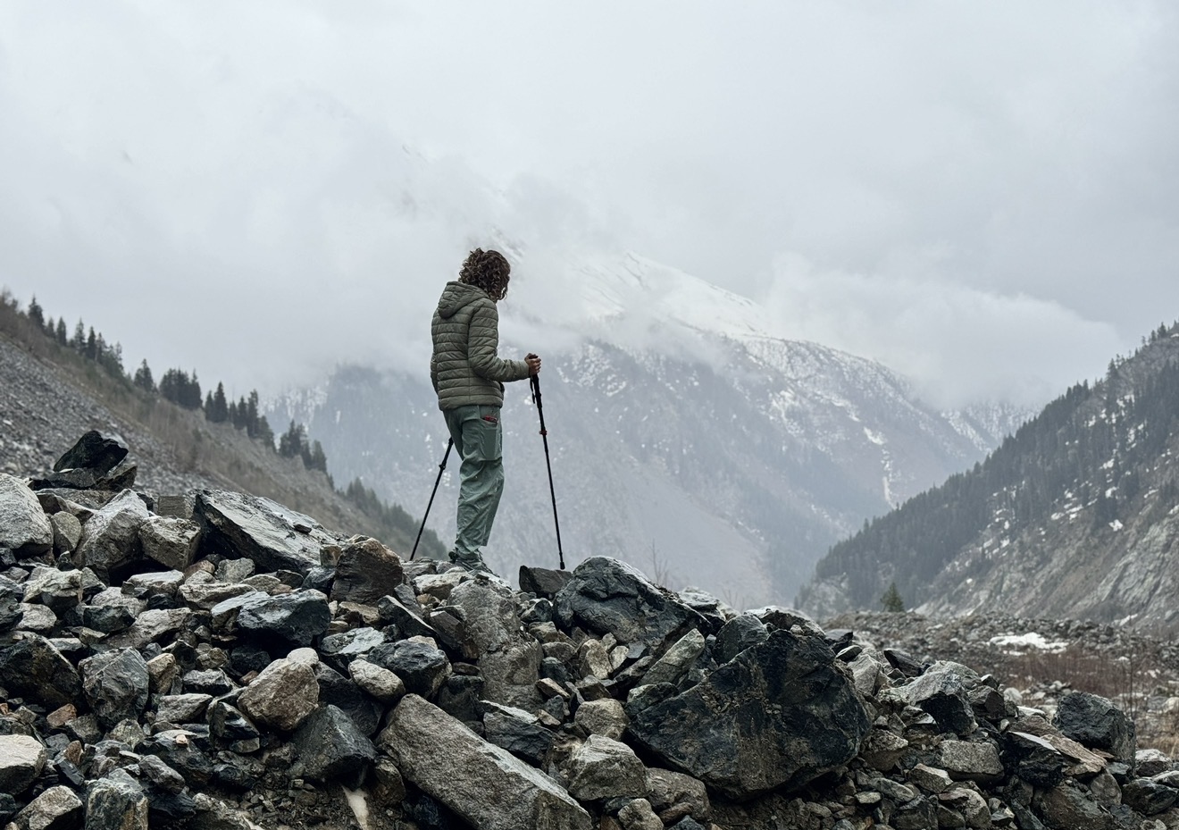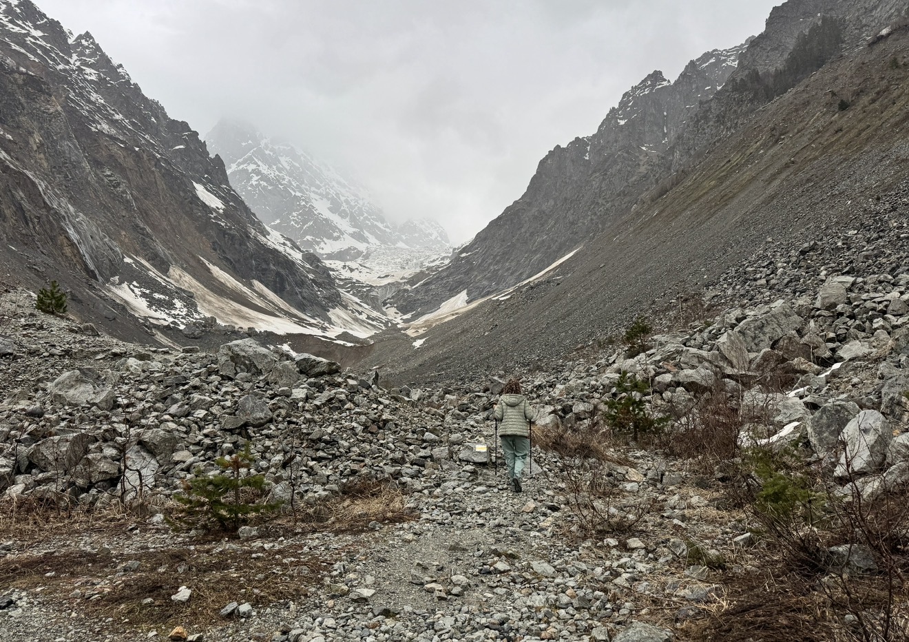 Тропа идёт вдоль горной реки, вода в которой прозрачная и ледяная — она стекает прямо с ледника. Пейзажи сменяют друг друга: мох, лес, каменные поля, шум воды — и наконец, впереди появляется он. Огромный, величественный, живой. Чалаади впечатляет масштабом: будто стоишь у ворот в другой мир.