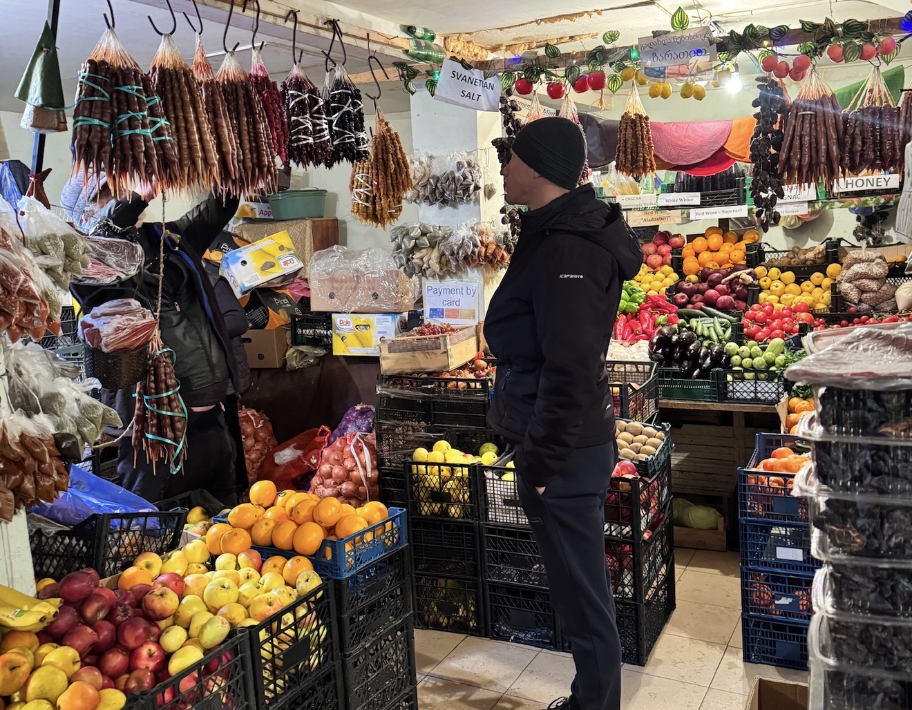 После музея зайдём на местный рынок — очень тёплое, колоритное место. Здесь можно попробовать домашний сыр, горный мёд, купить сванскую соль, ароматные травы, орехи, а также увидеть настоящую жизнь — с улыбками продавцов, запахом выпечки и неторопливой беседой между соседями.