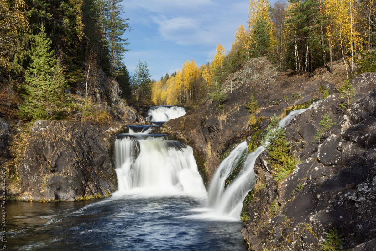 Рускеальские водопады на реке Тохмайоки, где снимались фильмы А зори здесь тихие, И на камнях растут деревья; Осмотр водопадов со смотровой площадки без оплаты.