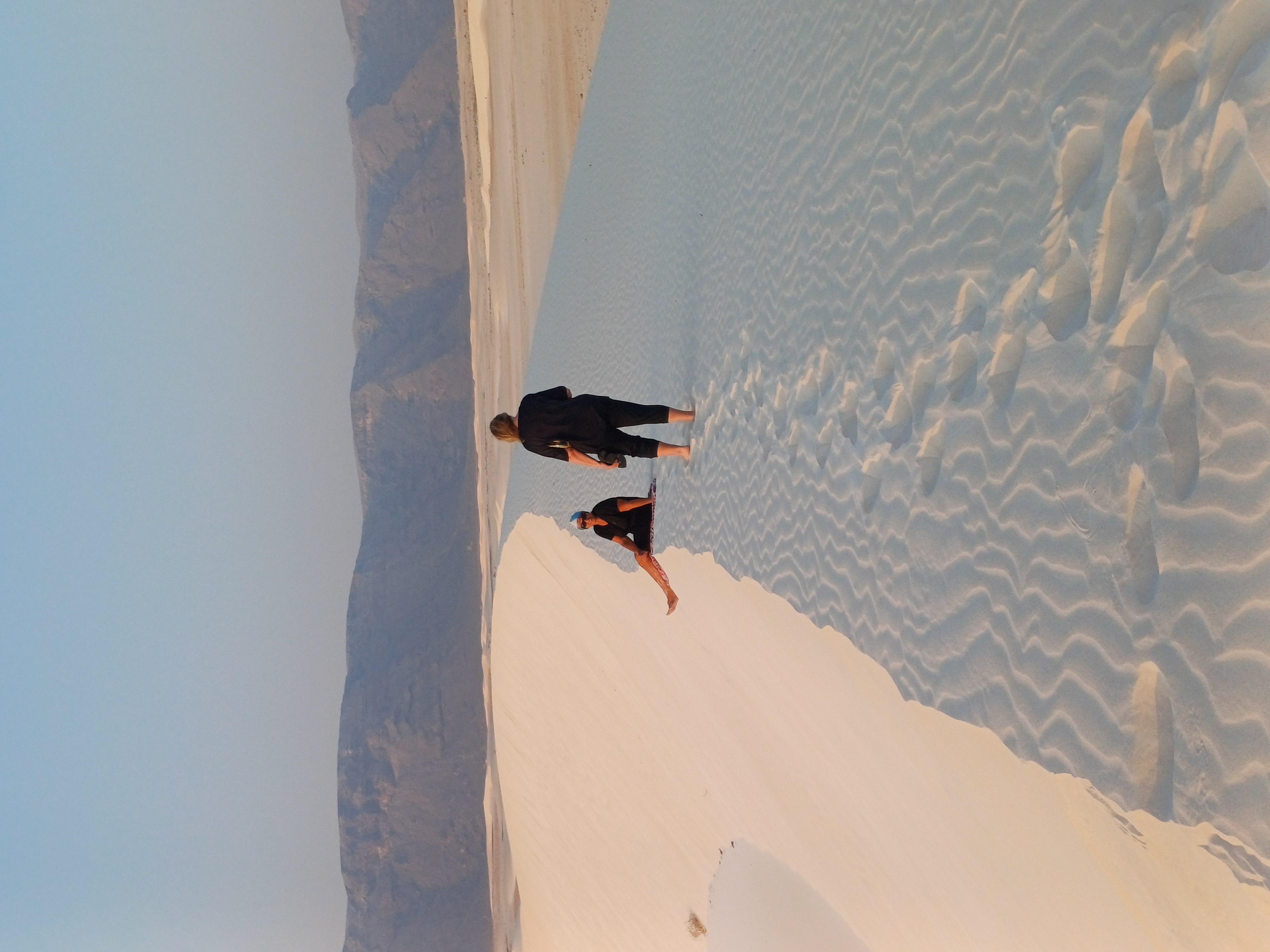 Подъём на вершину песчаного массива: слева — лазурный океан, справа — горный хребет, рядом — волнистые белые дюны. Ощутите себя на краю мира!