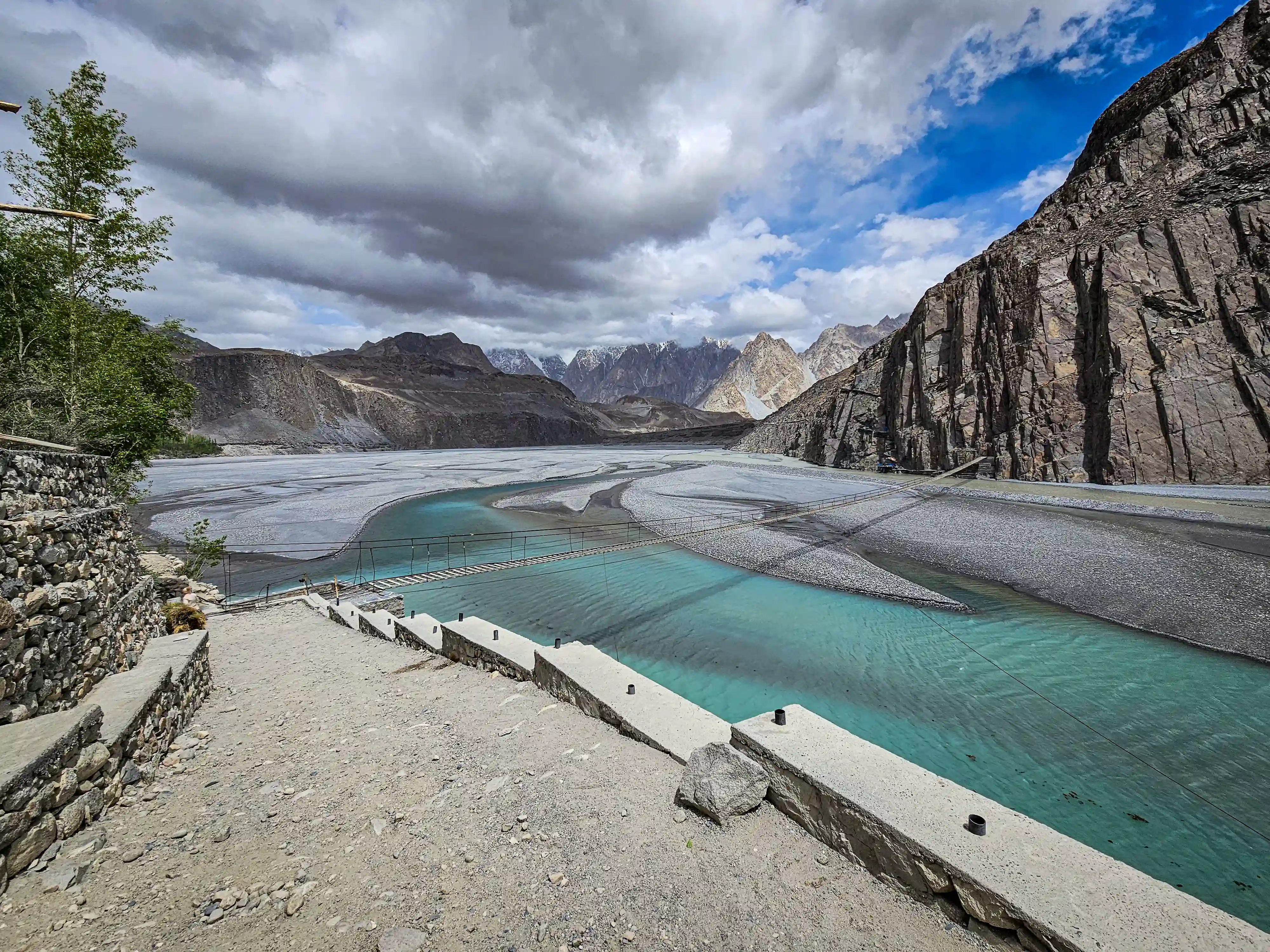 Мост Хуссаини — длинный подвесной мост на реке Хунза. Для нас это будет возможность получить порцию экстремальных ощущений. Мост шатается и раскачивается от ветра, расстояние между досками сантиметров 30, а внизу быстро несёт свои холодные воды река Хунза. Считается, что для того, чтобы мост имел меньшую парусность, расстояния между досками были увеличены специально при постройке. Ведь ветры в этих местах бывают очень сильны.