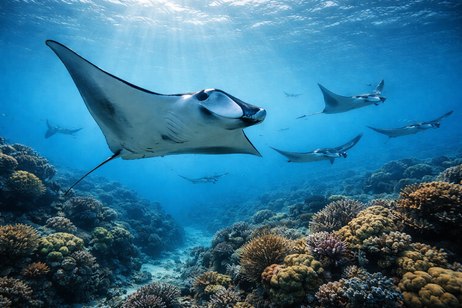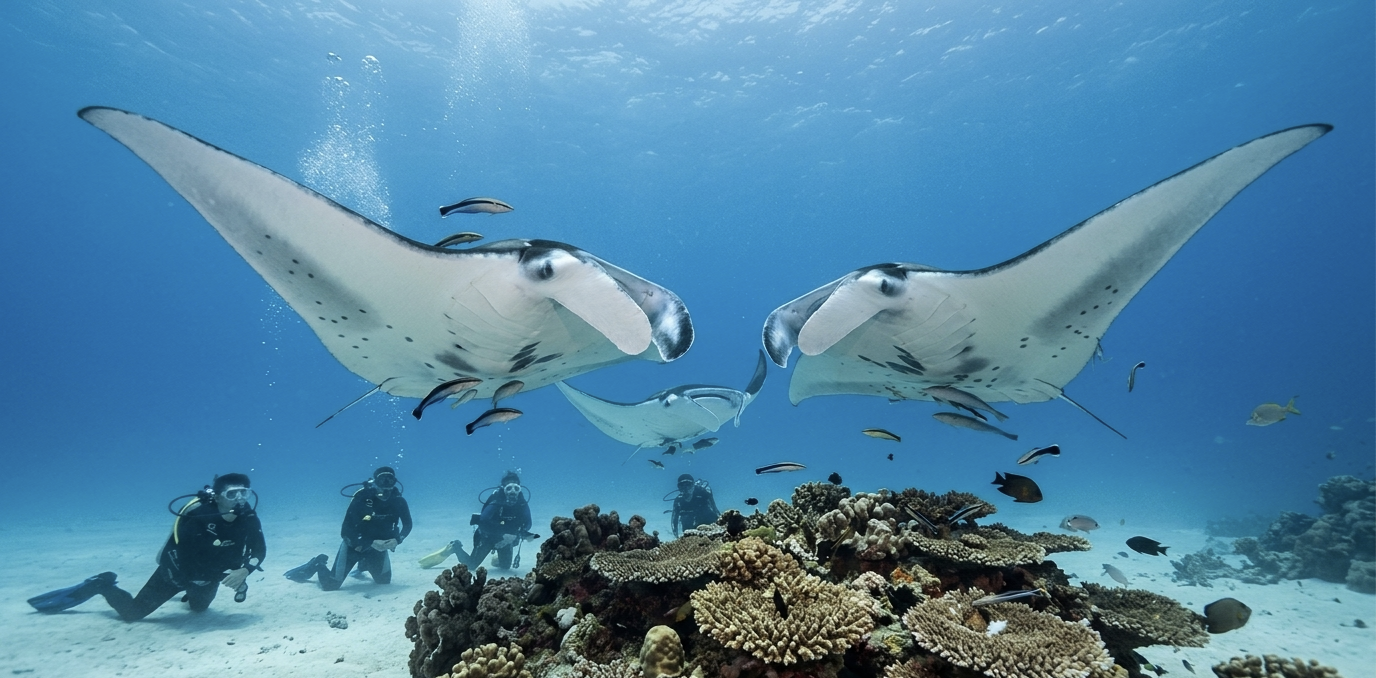 German Channel — место, где время будто замирает. Манты приходят на станции очистки спокойно и величественно. Вы опускаетесь на глубину и наблюдаете, как они кружат над рифом — без резких движений, почти медитативно.