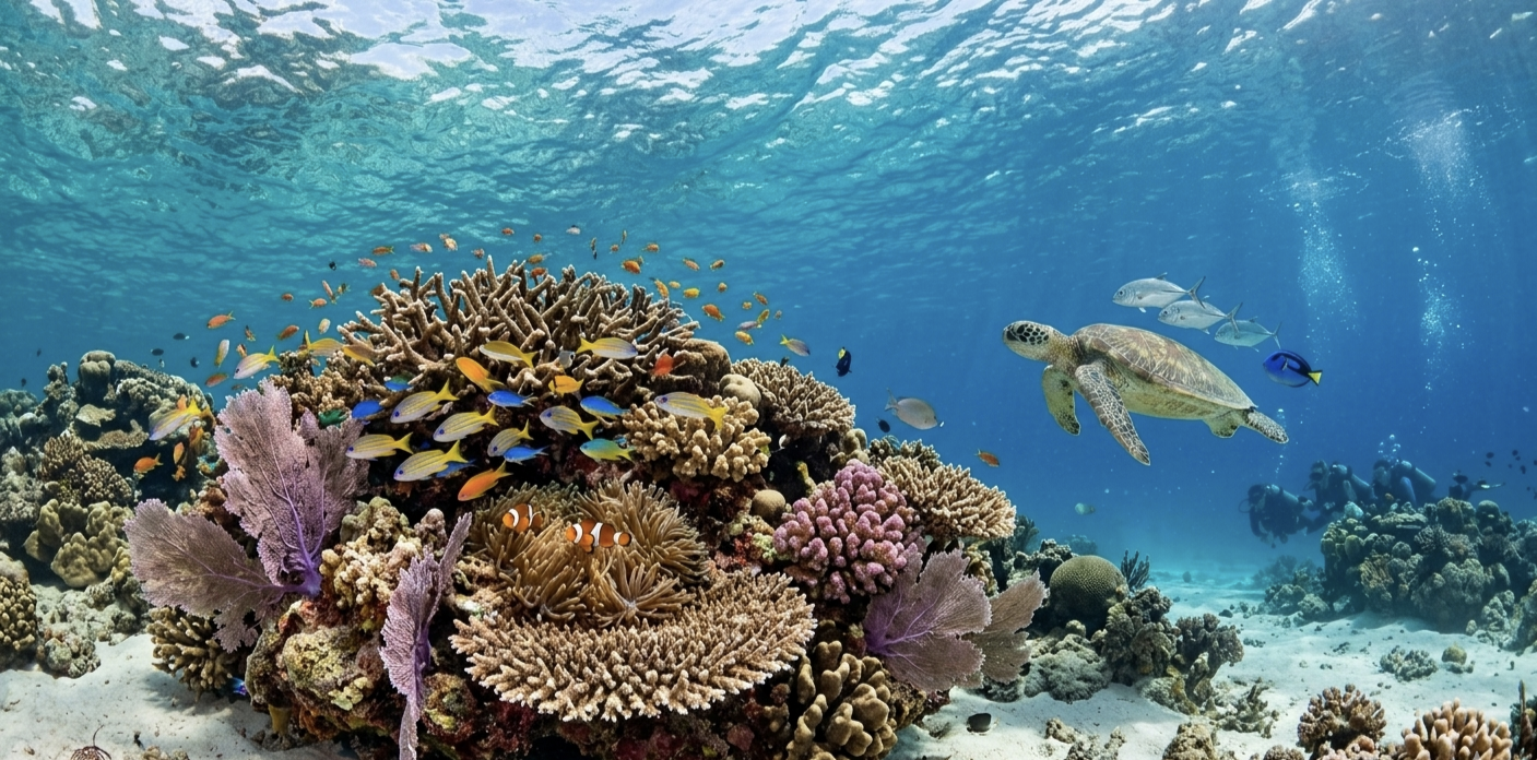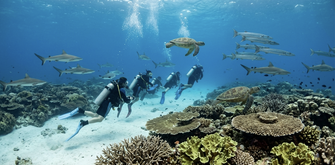 После динамичных дайвов юга маршрут становится чуть спокойнее. Бирюзовые лагуны, прозрачная вода, возможность снорклинга и более расслабленные погружения.